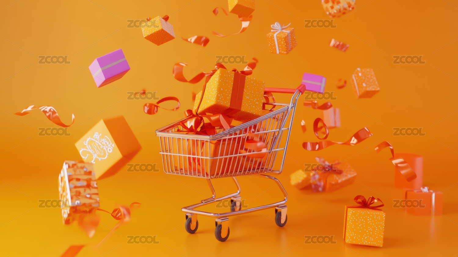 黄色背景下的购物车和礼物特写镜头