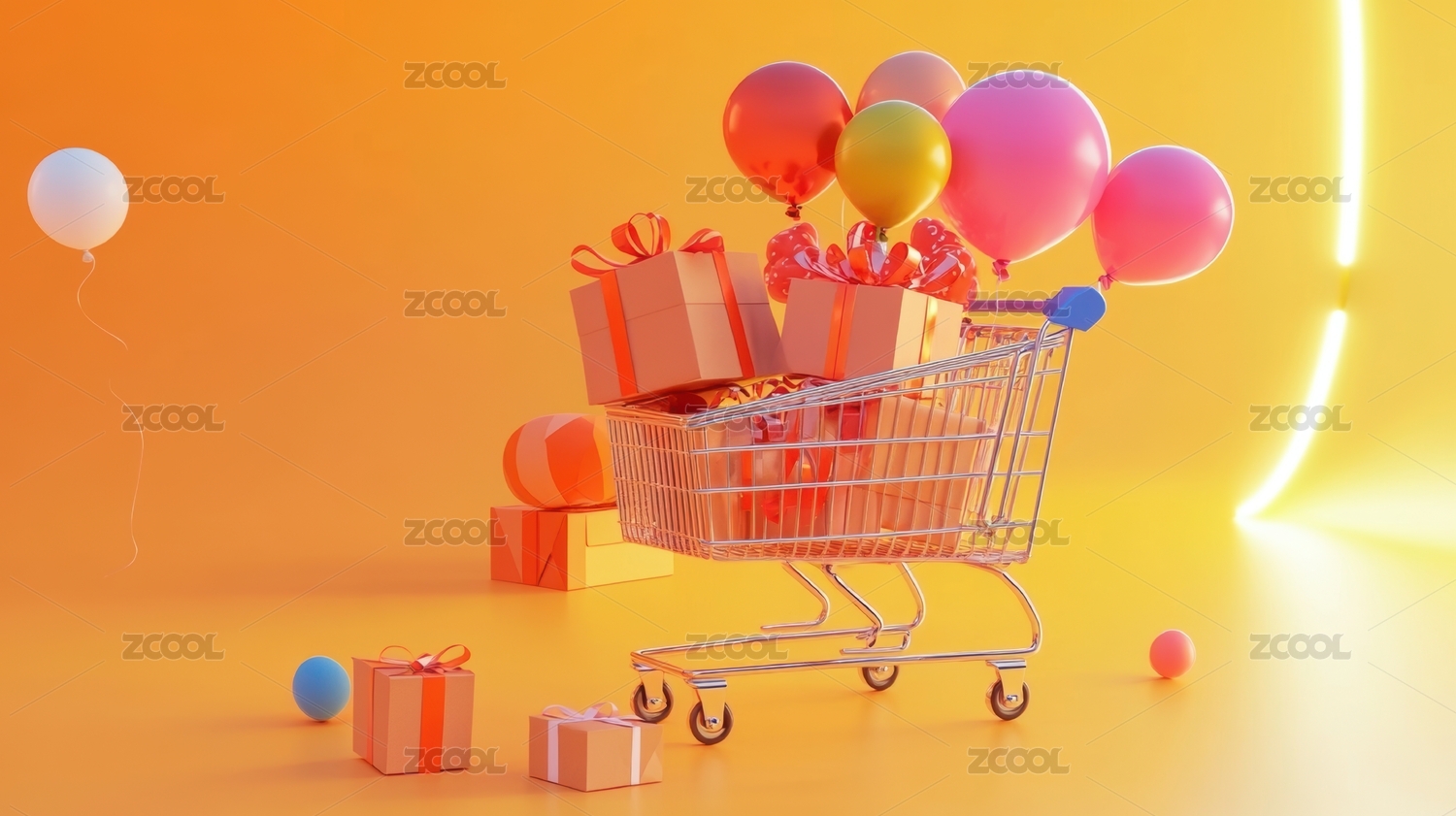 橙色背景下的购物车和彩色气球的特写镜头