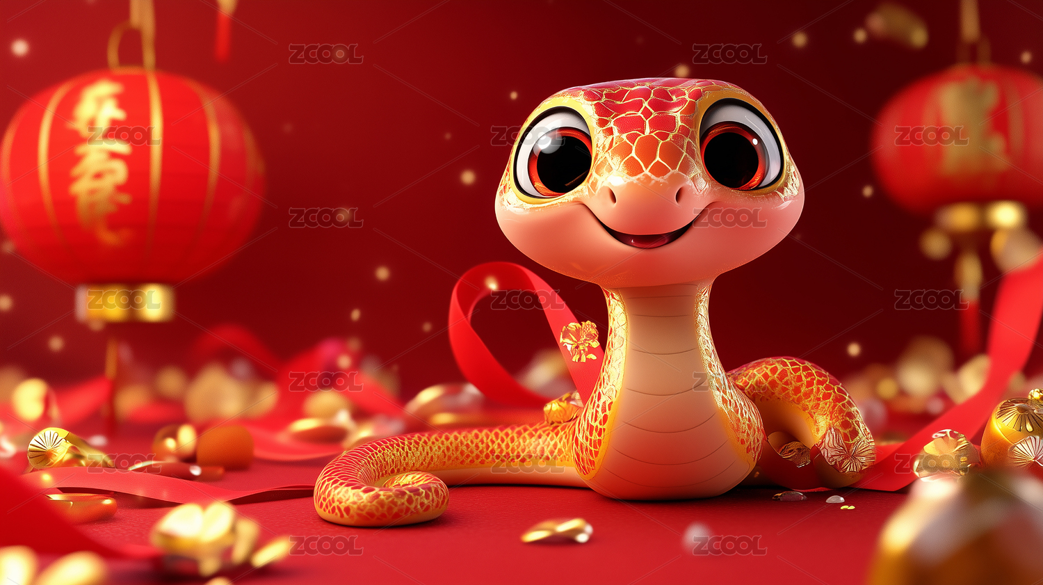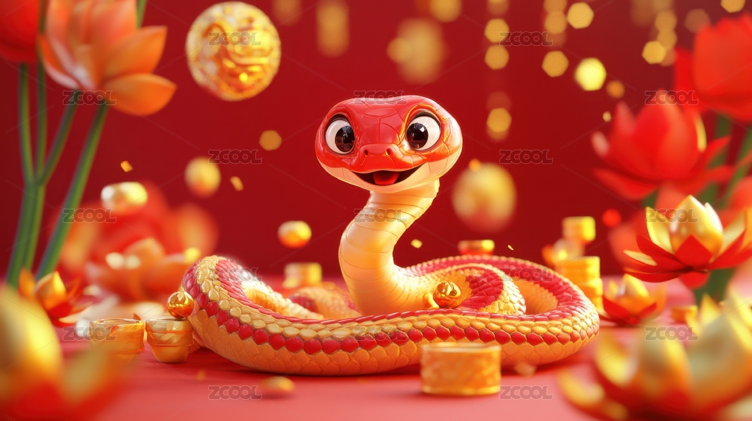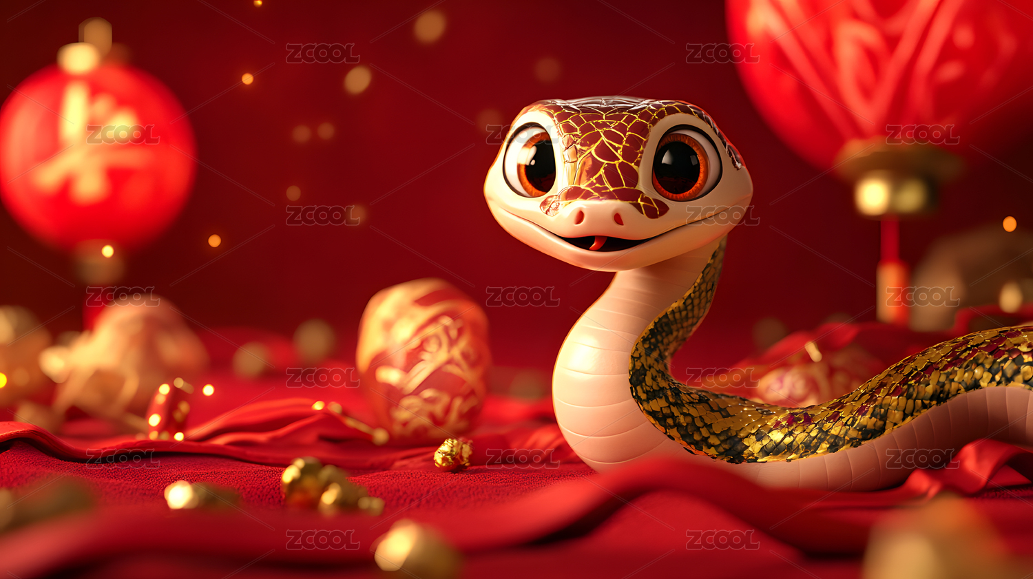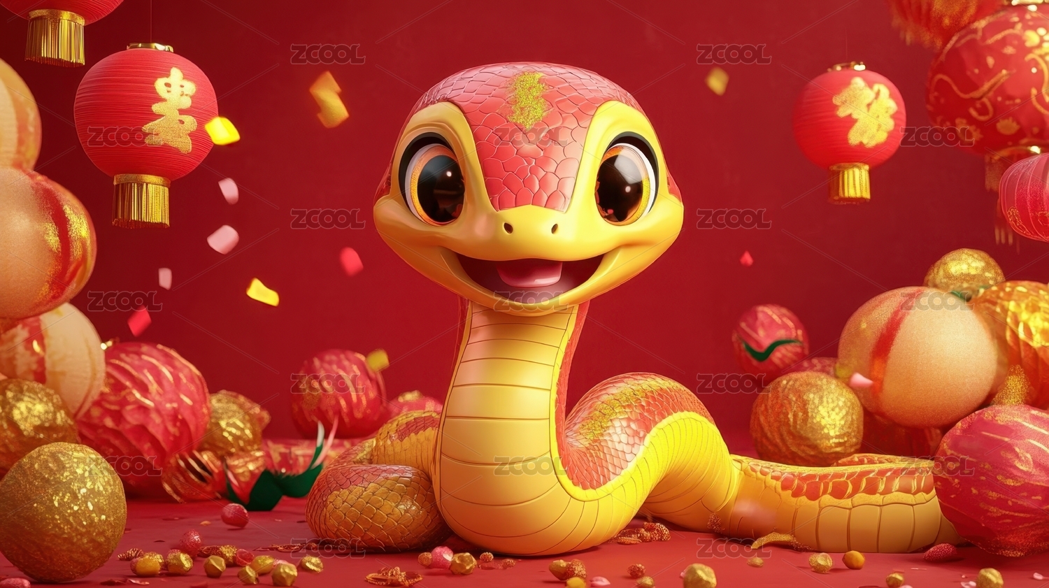 新年卡通3d蛇年灯笼金币喜庆场景形象