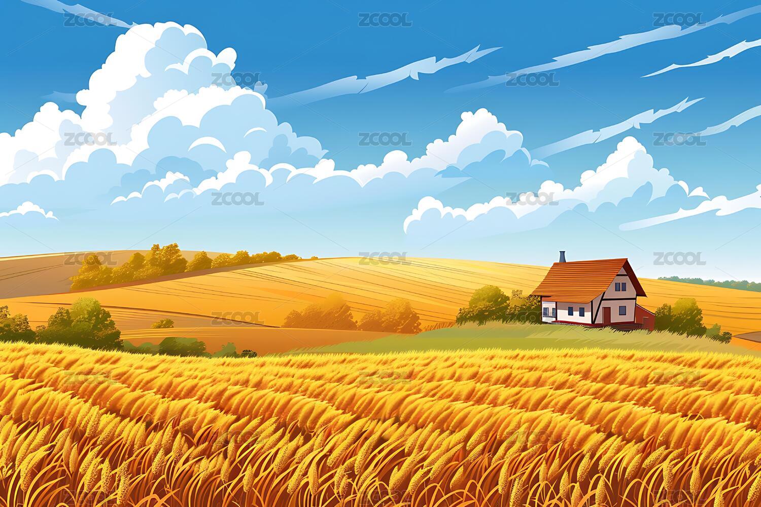 夏季麦田与农舍的风景