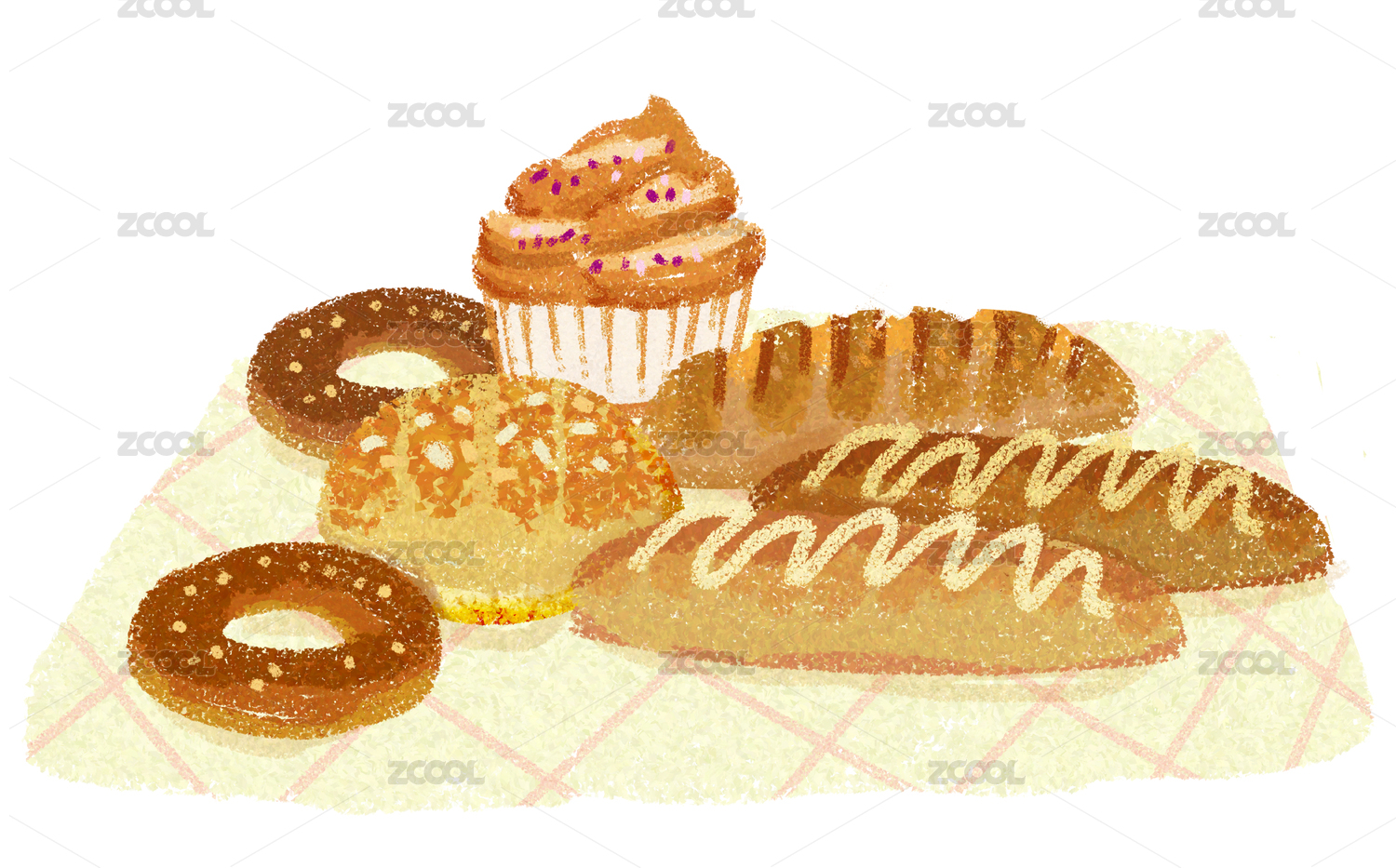放在桌布上的各类面包插图,手绘肌理感插画