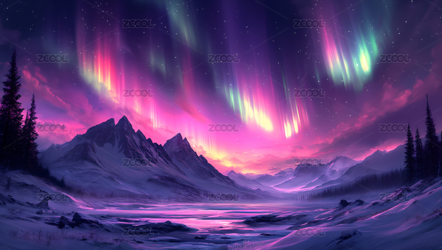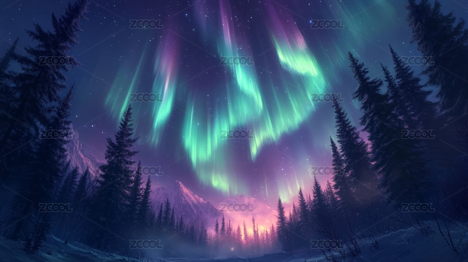 极光下的雪山森林