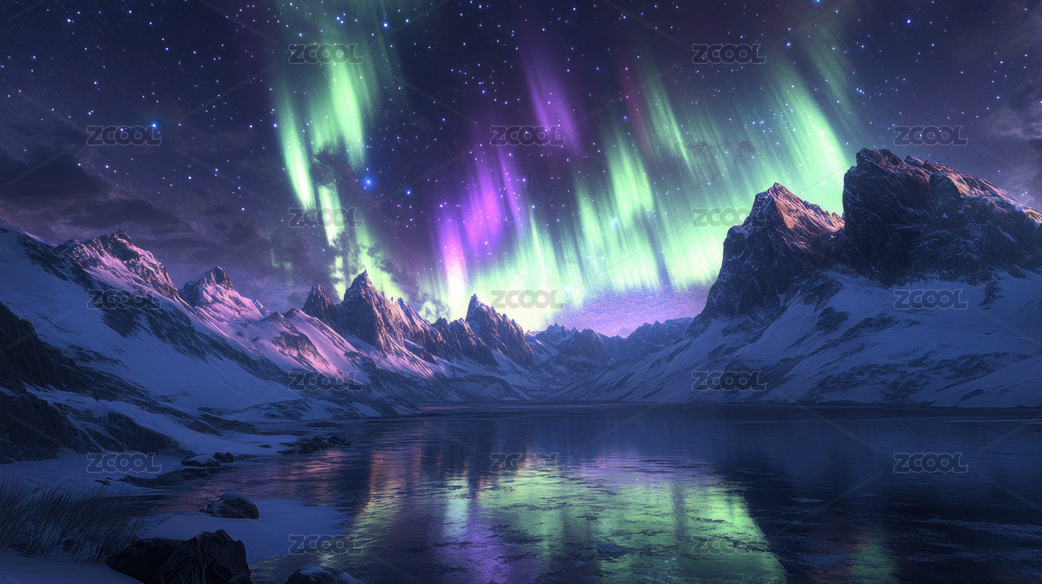 极光下的雪山夜景