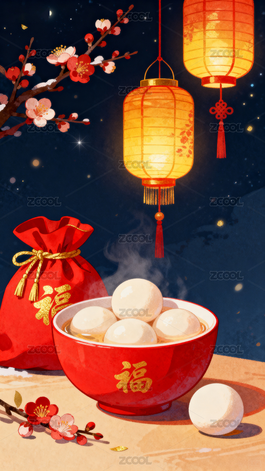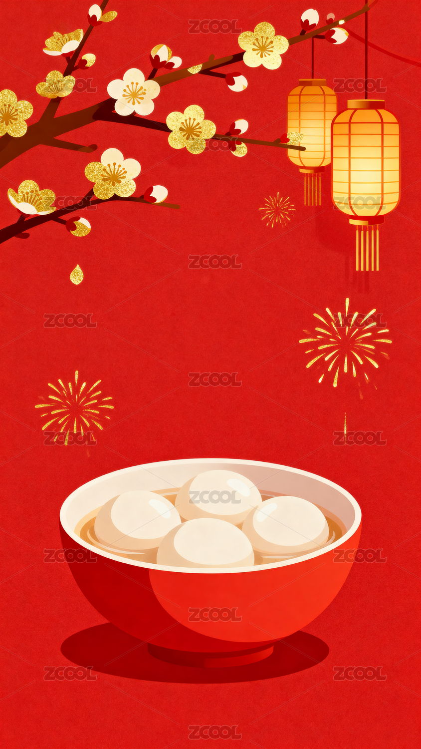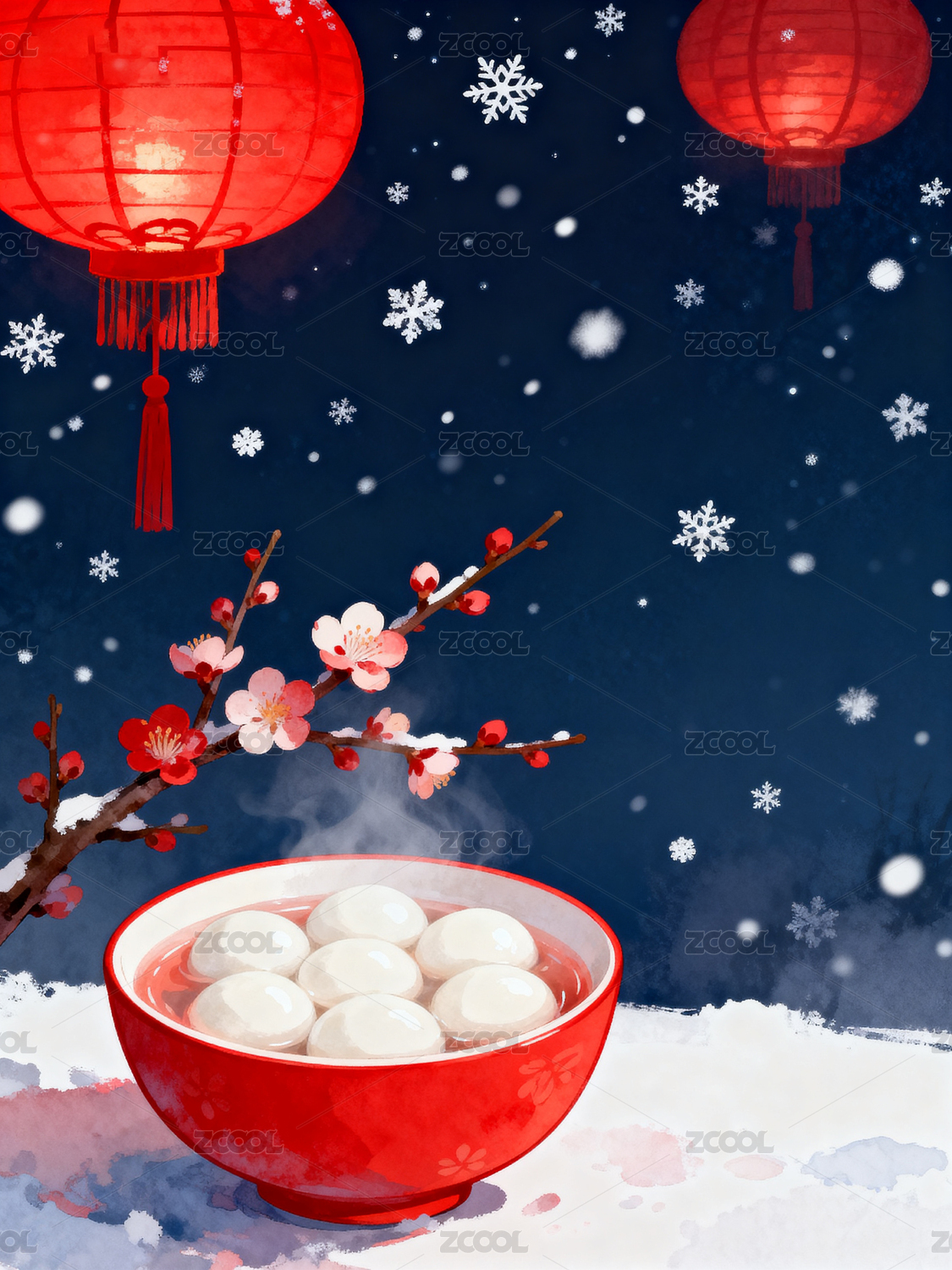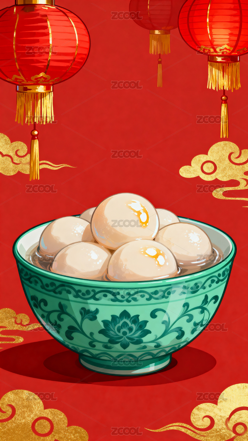 元宵节,节日,汤圆,插画,食物,美食,新年,灯笼,水彩,传统