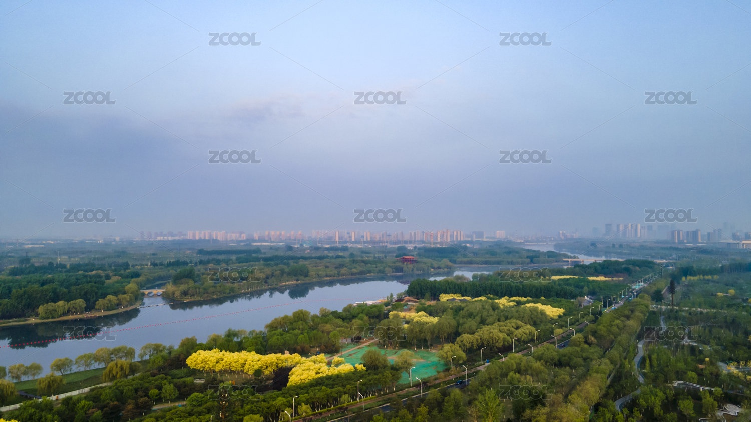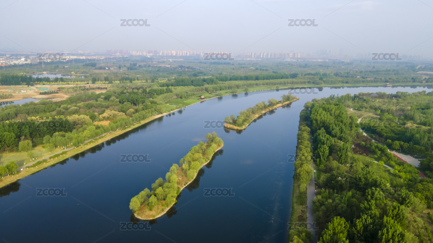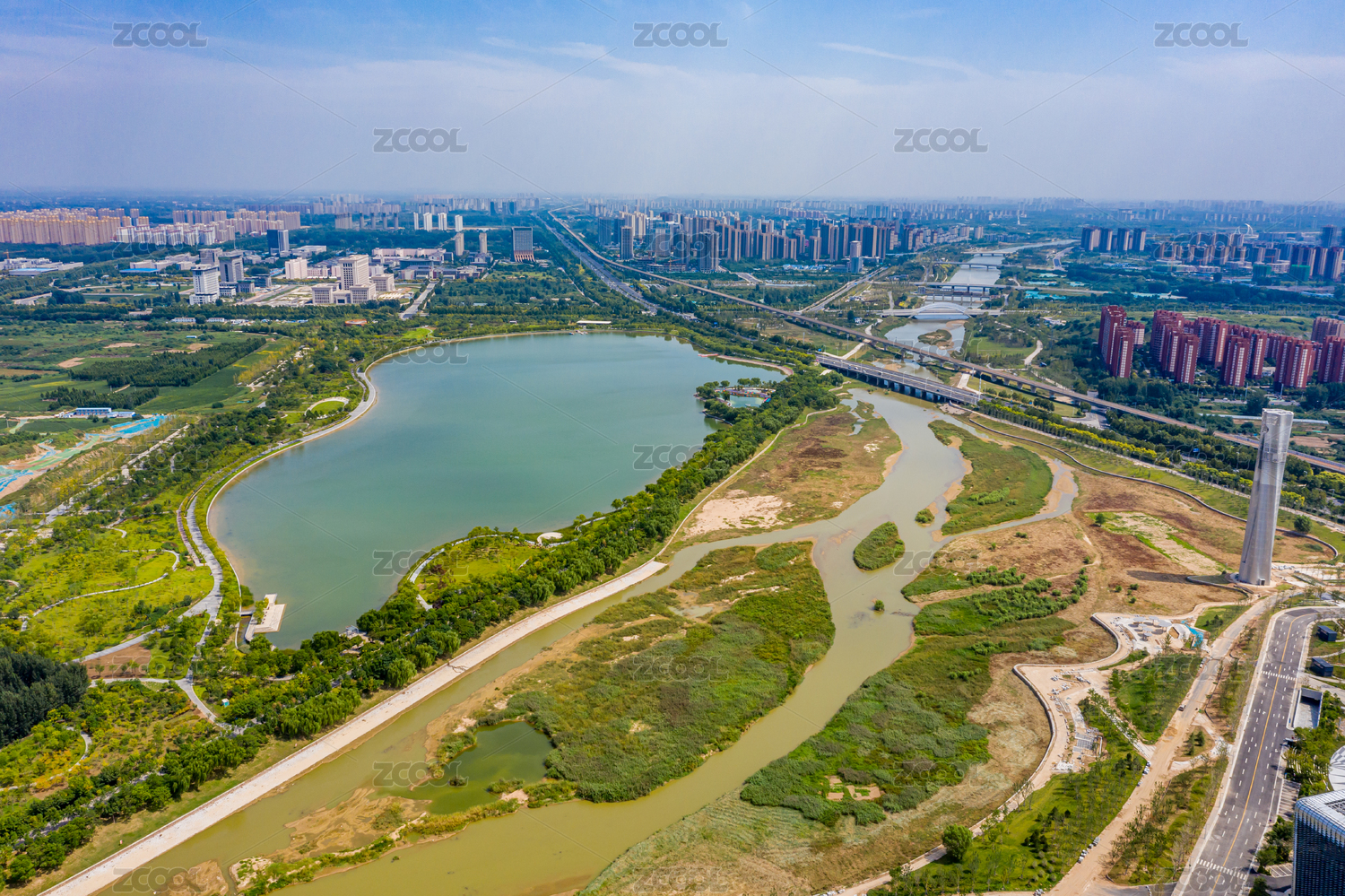 航拍河南郑州象湖生态湿地公园及贾鲁河水系