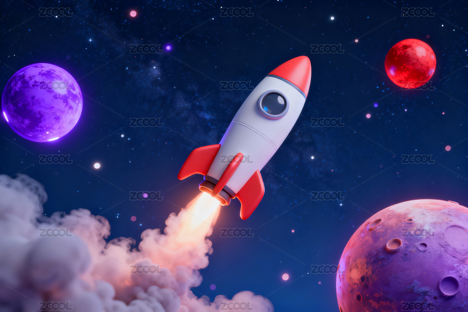 火箭发射穿越紫色星球的太空场景