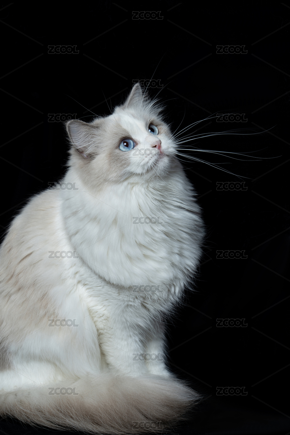 黑色背景前一只白色的布偶猫