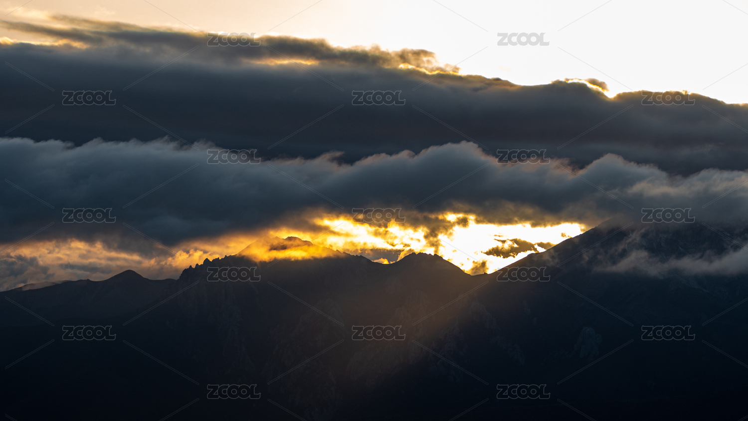 阴沉天空下的雪山露出一缕光线