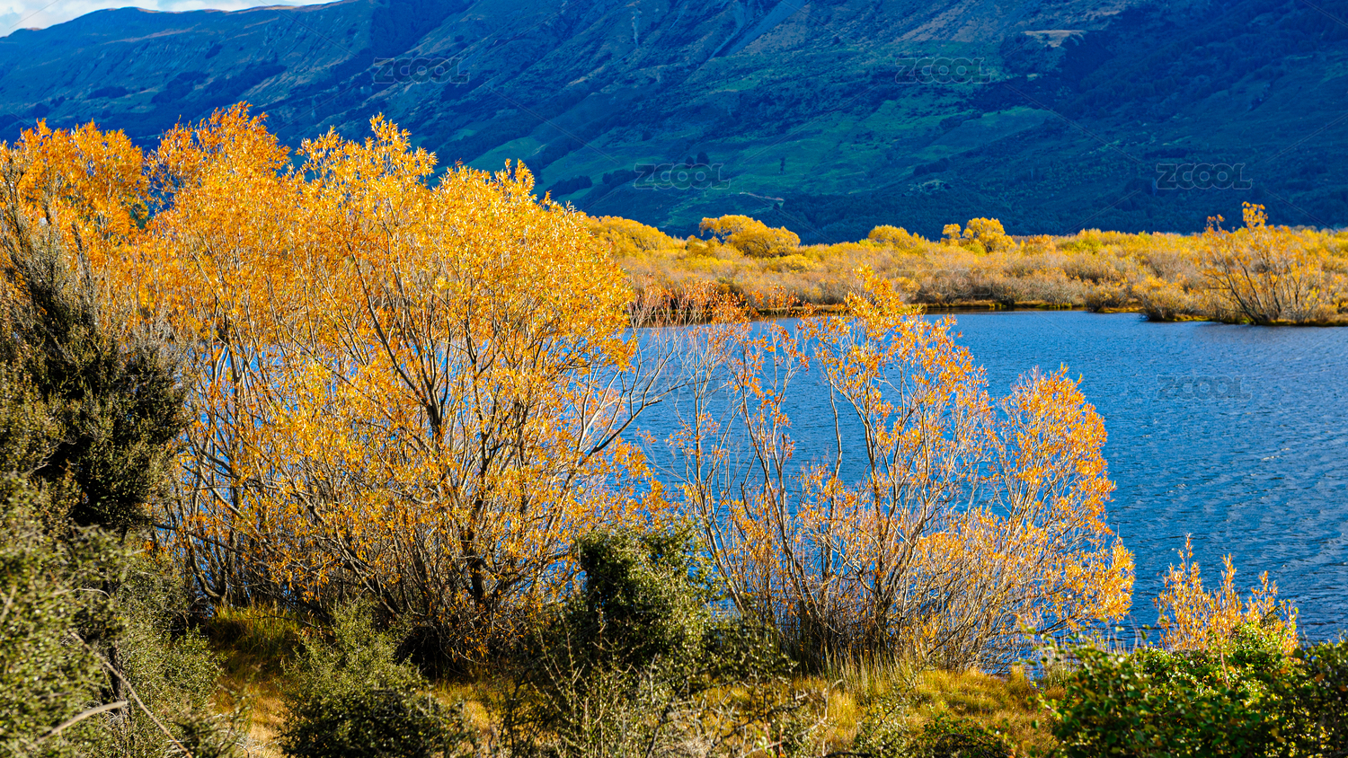 新西兰格林诺奇秋日湖畔雪山与彩林