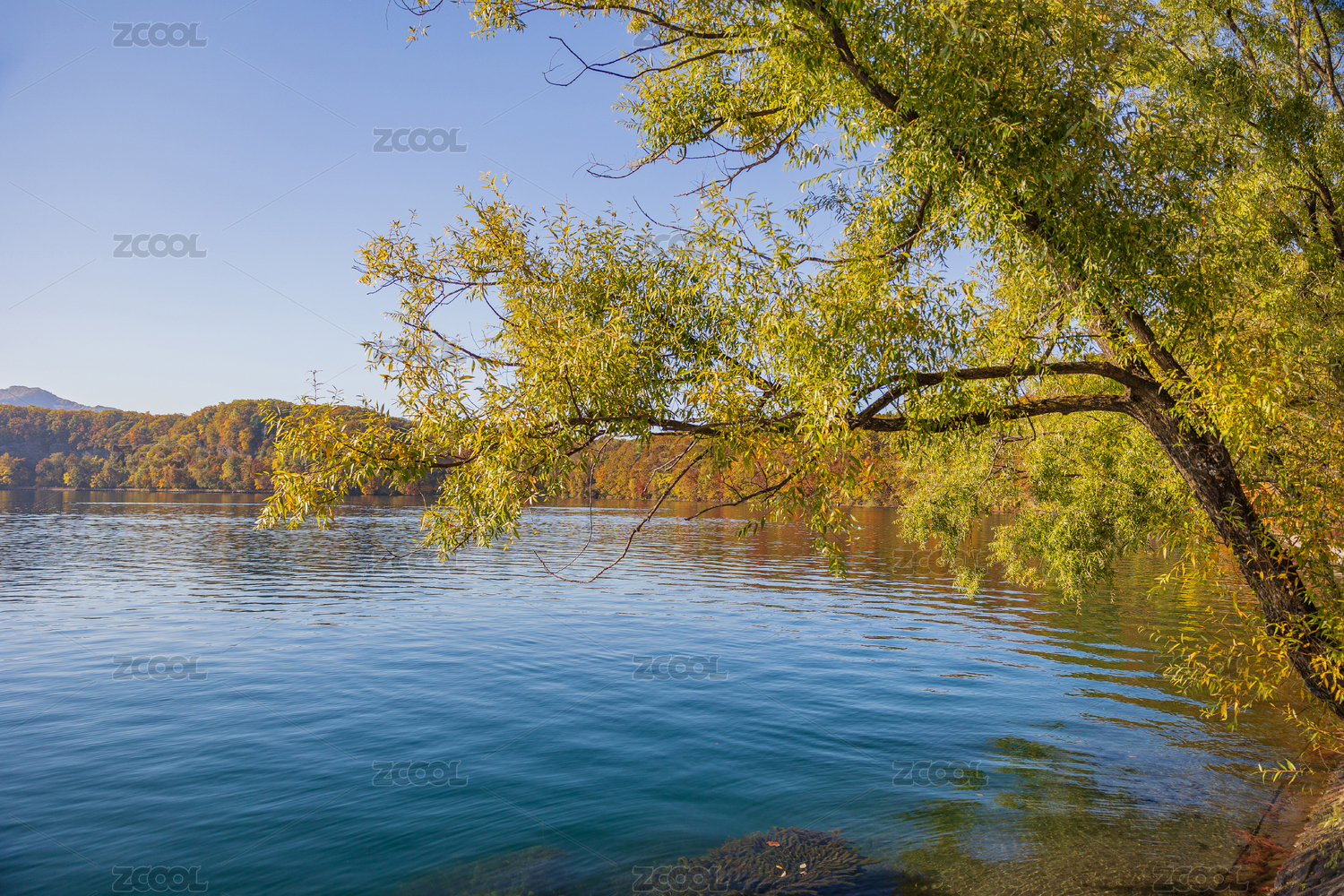 秋日湖畔的秋林黄叶景色