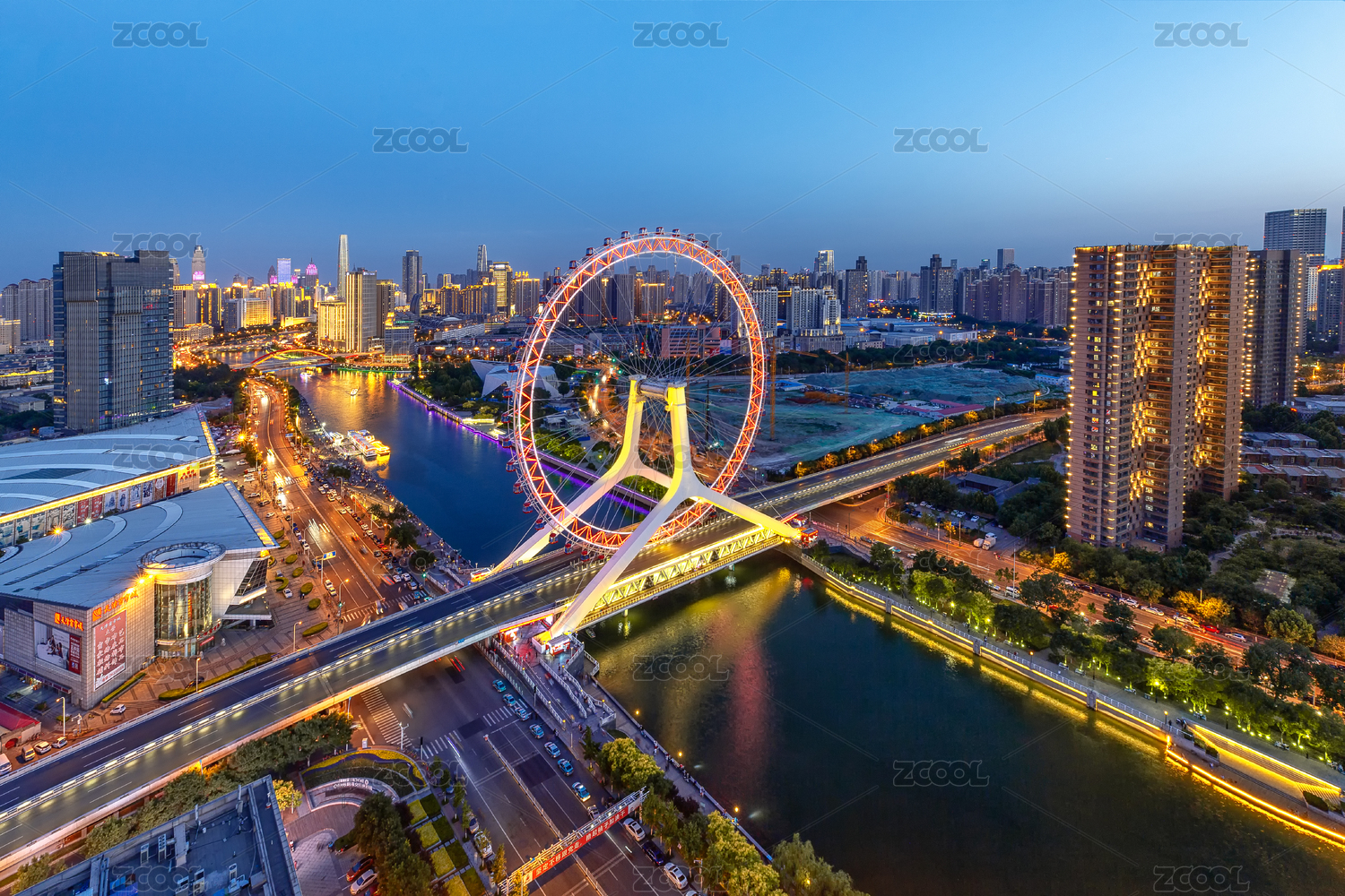 天津市天津之眼摩天轮和市区建筑夜景航拍图