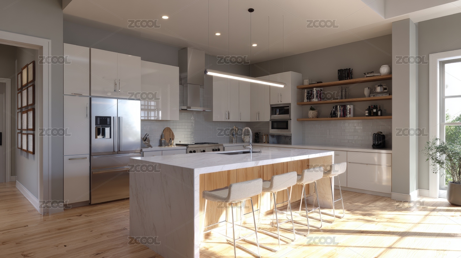 厨房,橱柜,岛台,吊灯,冰箱,微波炉,烤箱,凳子,大理石台面,木质