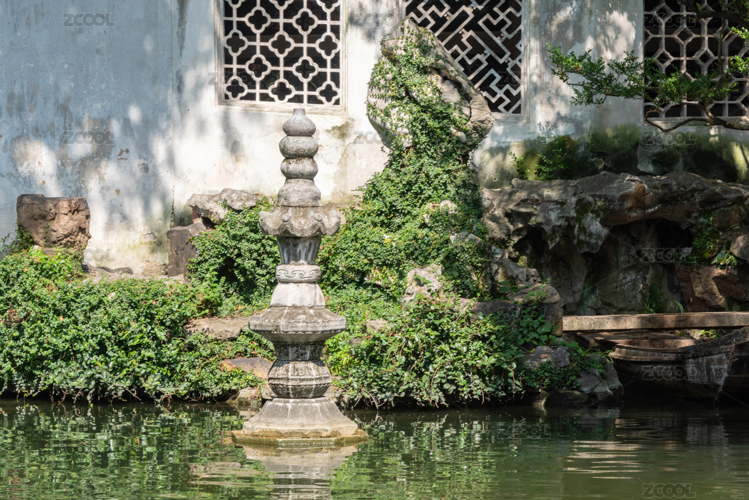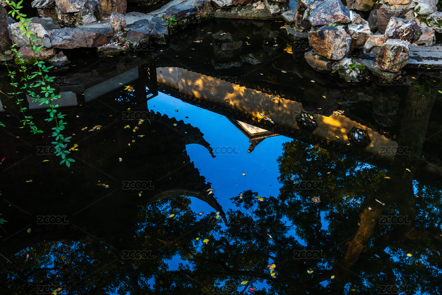江苏拙政园苏州园林水中石塔倒影与谁同坐轩