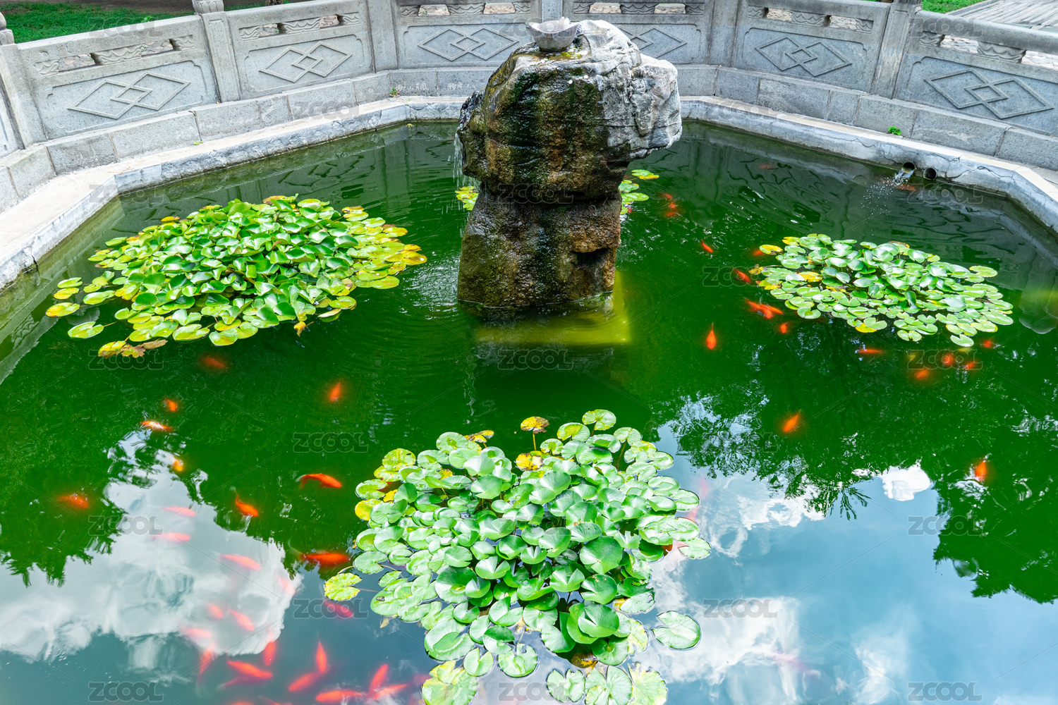 岱庙里的鱼池假山和锦鲤拍摄主题