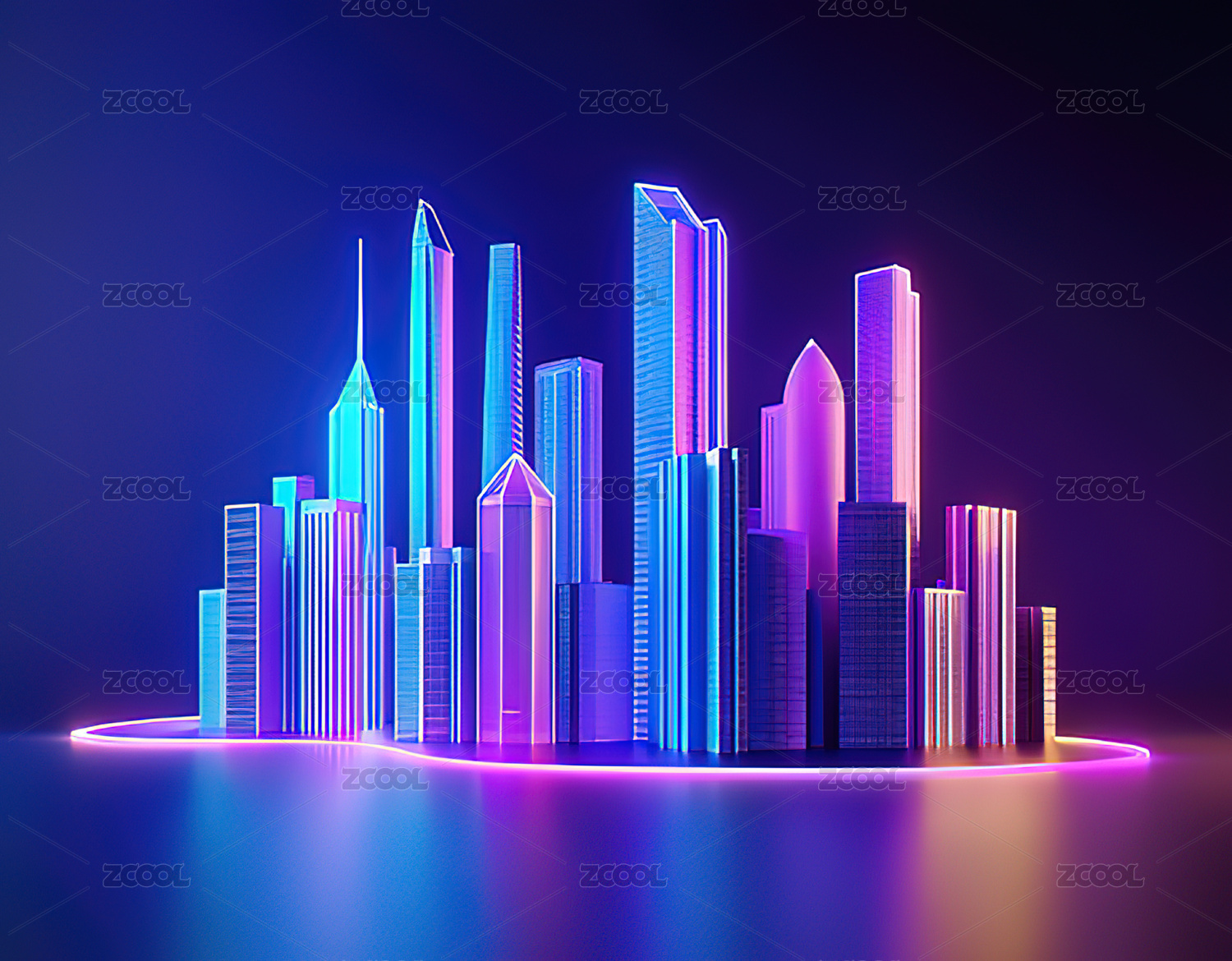 梦幻荧光色城市建筑赛博3D卡通立体插画