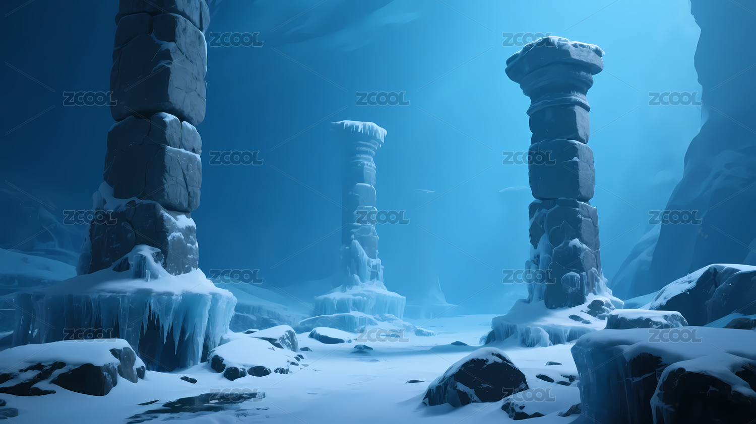 冰覆盖石柱水下景观