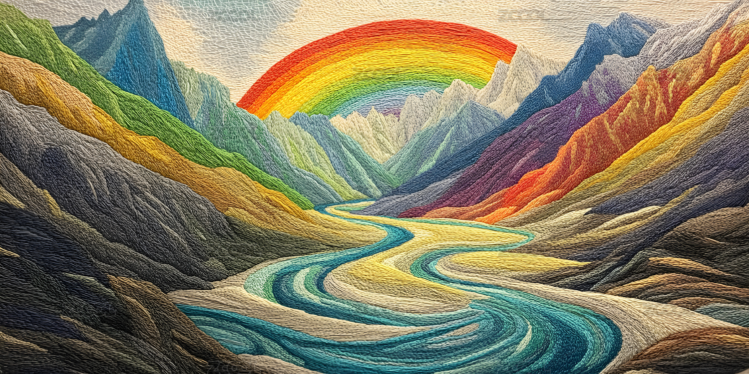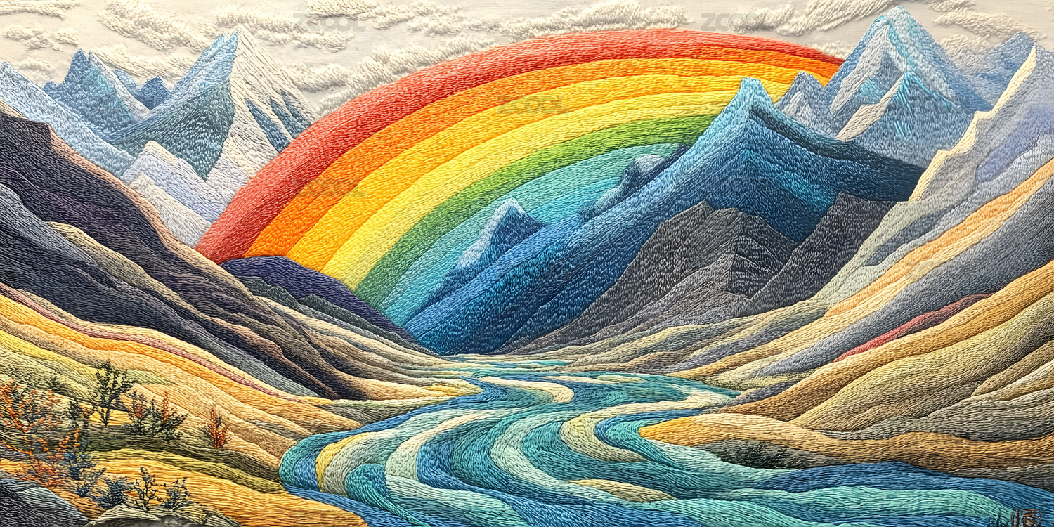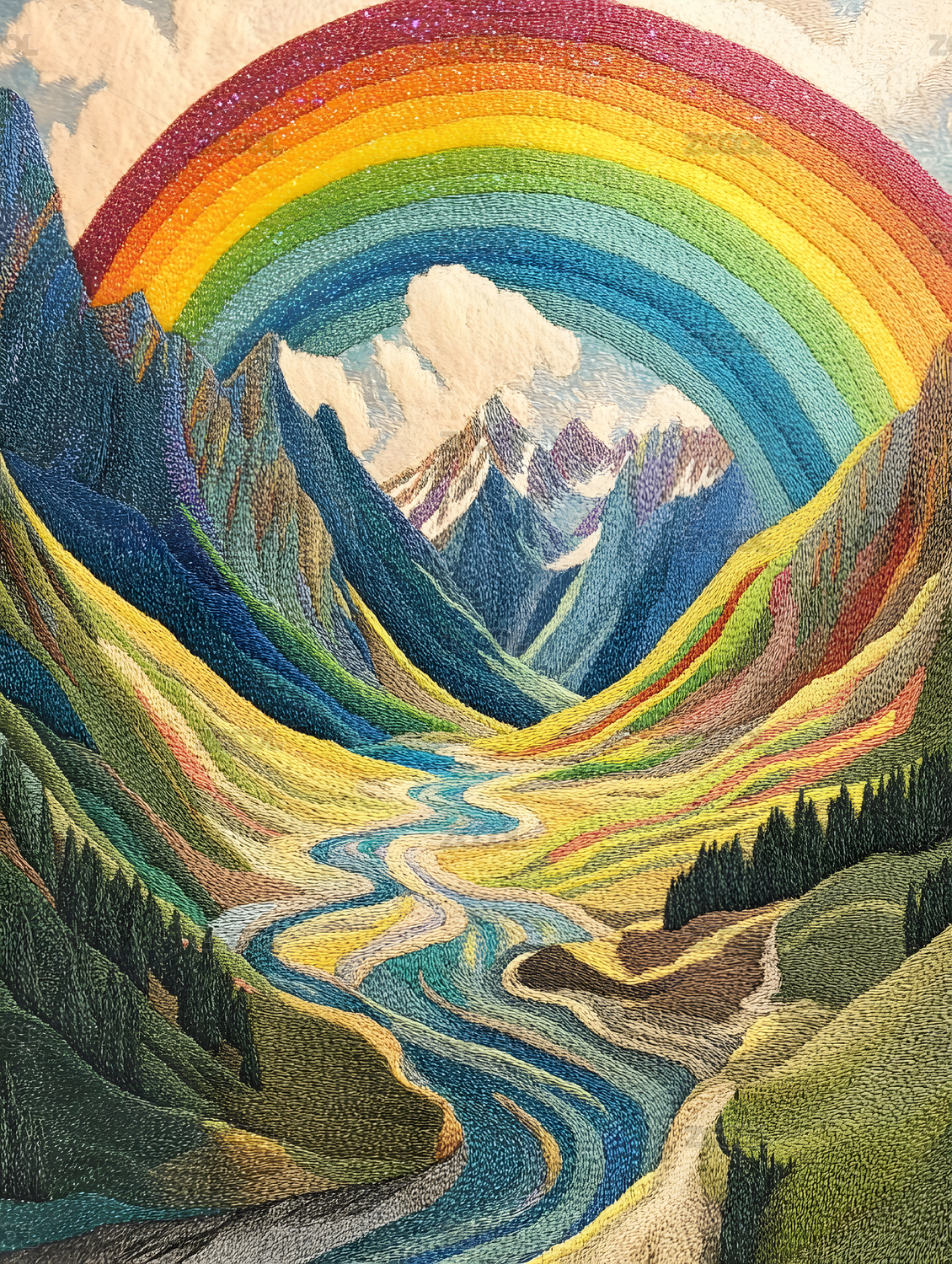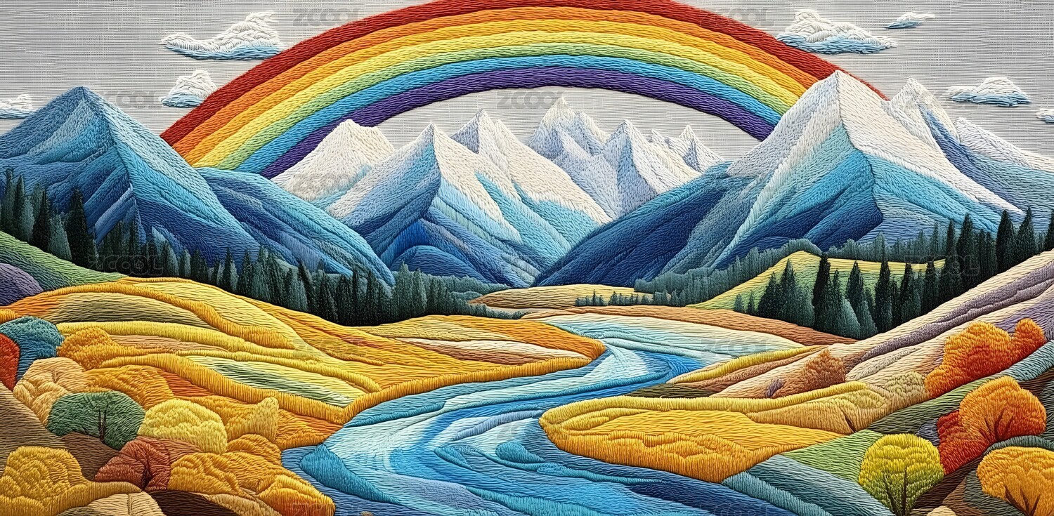 商务,中式,国风,风景,彩虹,高山,小河,插画,背景板,海报