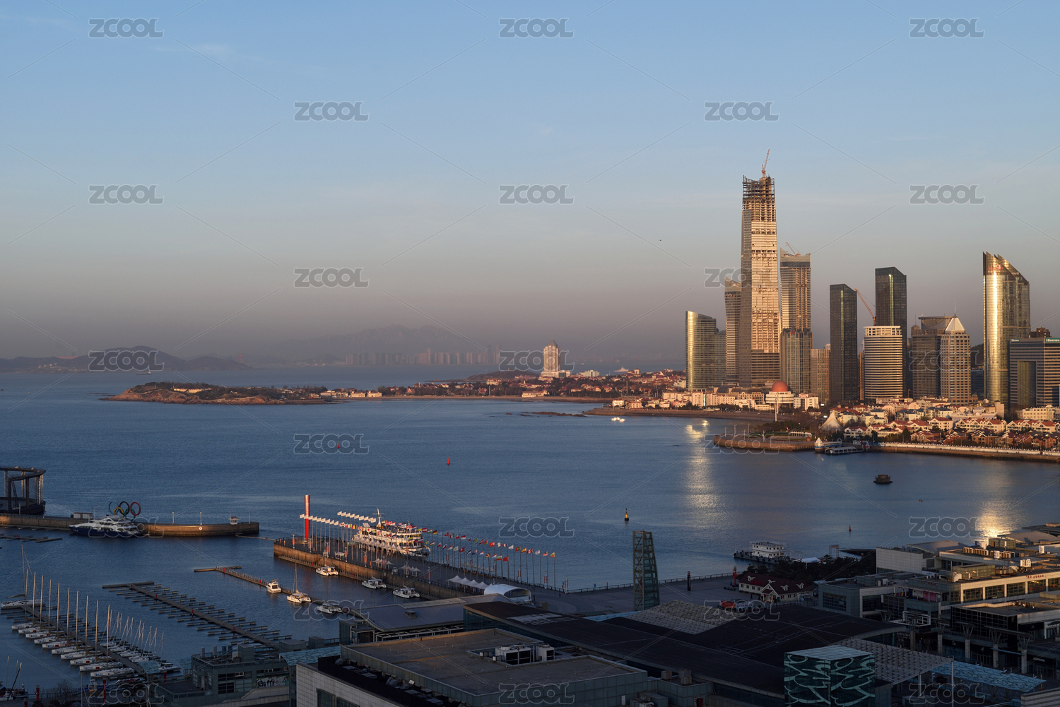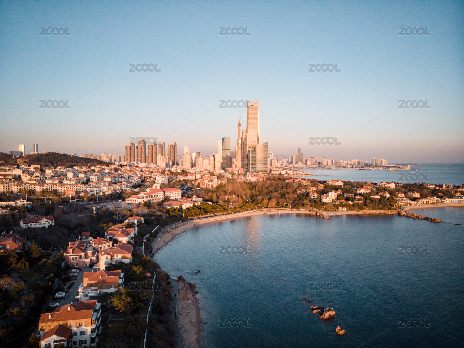 山东省青岛市栈桥风景区海岸线天际线航拍