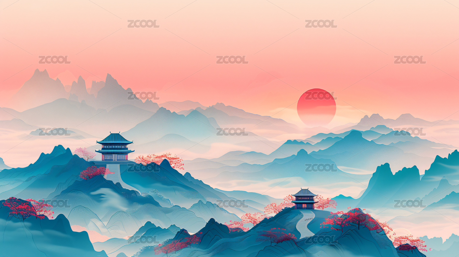 中国风建筑山脉剪纸艺术插画场景海报壁纸