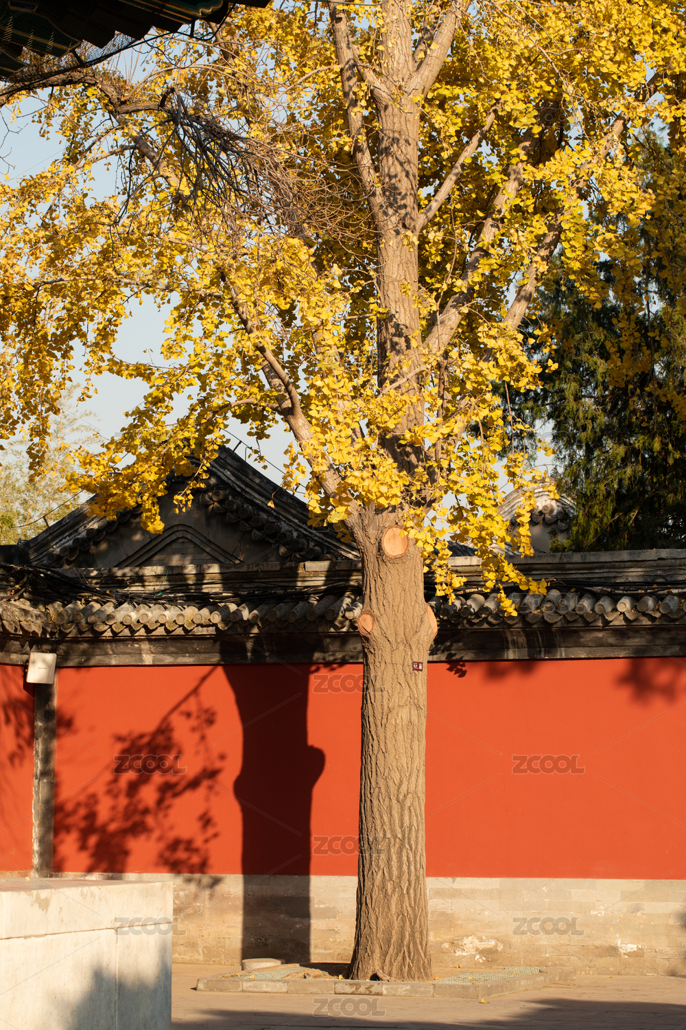 颐和园红墙前面一颗金黄色的银杏树