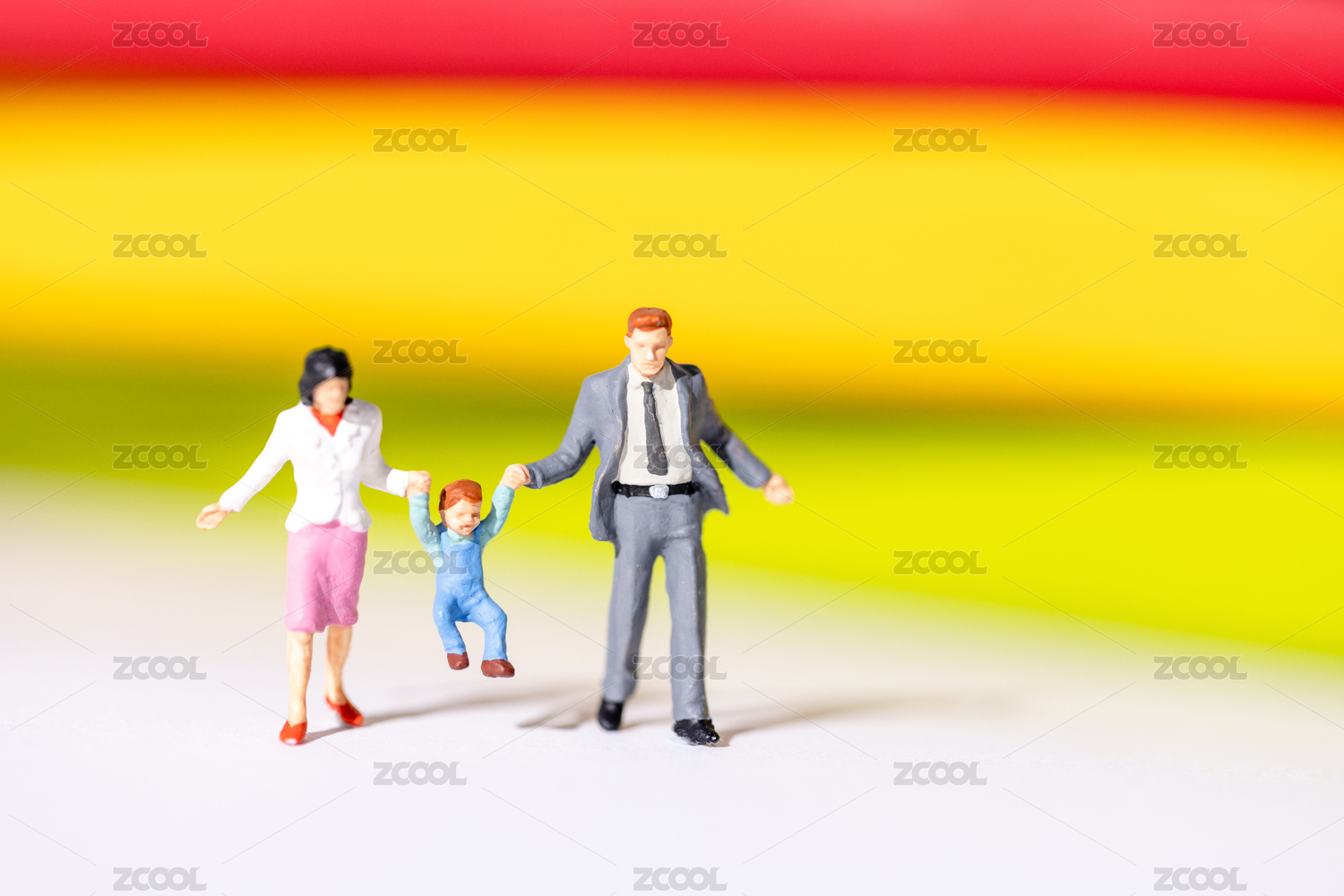 三口之家爸爸妈妈牵着孩子开心跳跃微缩小人