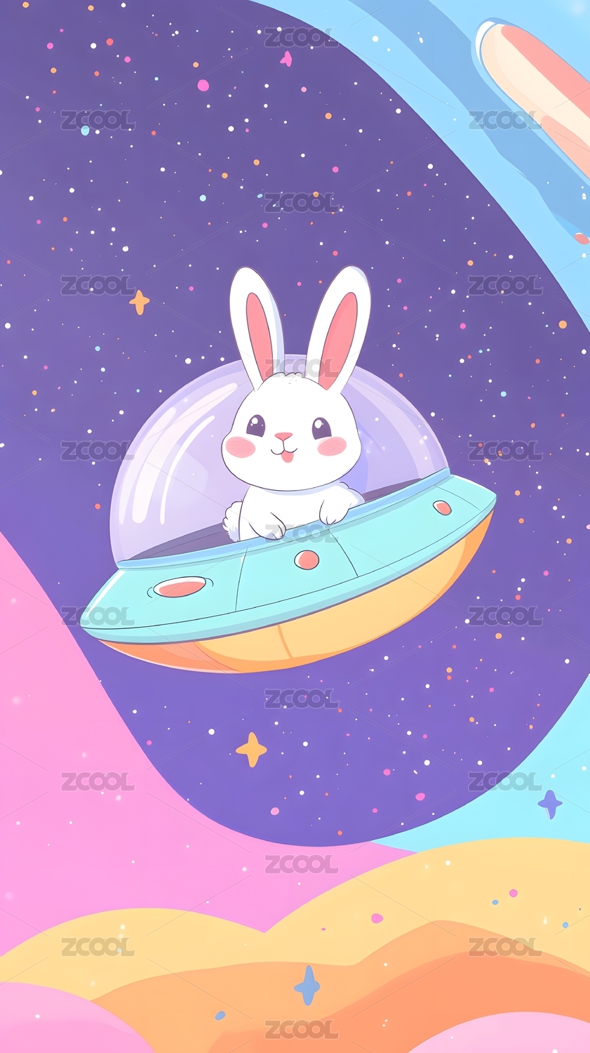 中秋节插画玉兔开着宇宙飞船在太空寻找月饼