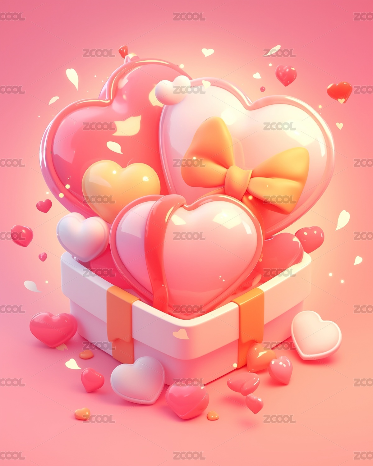 粉色背景中的爱心情人节丝带礼盒3D渲染
