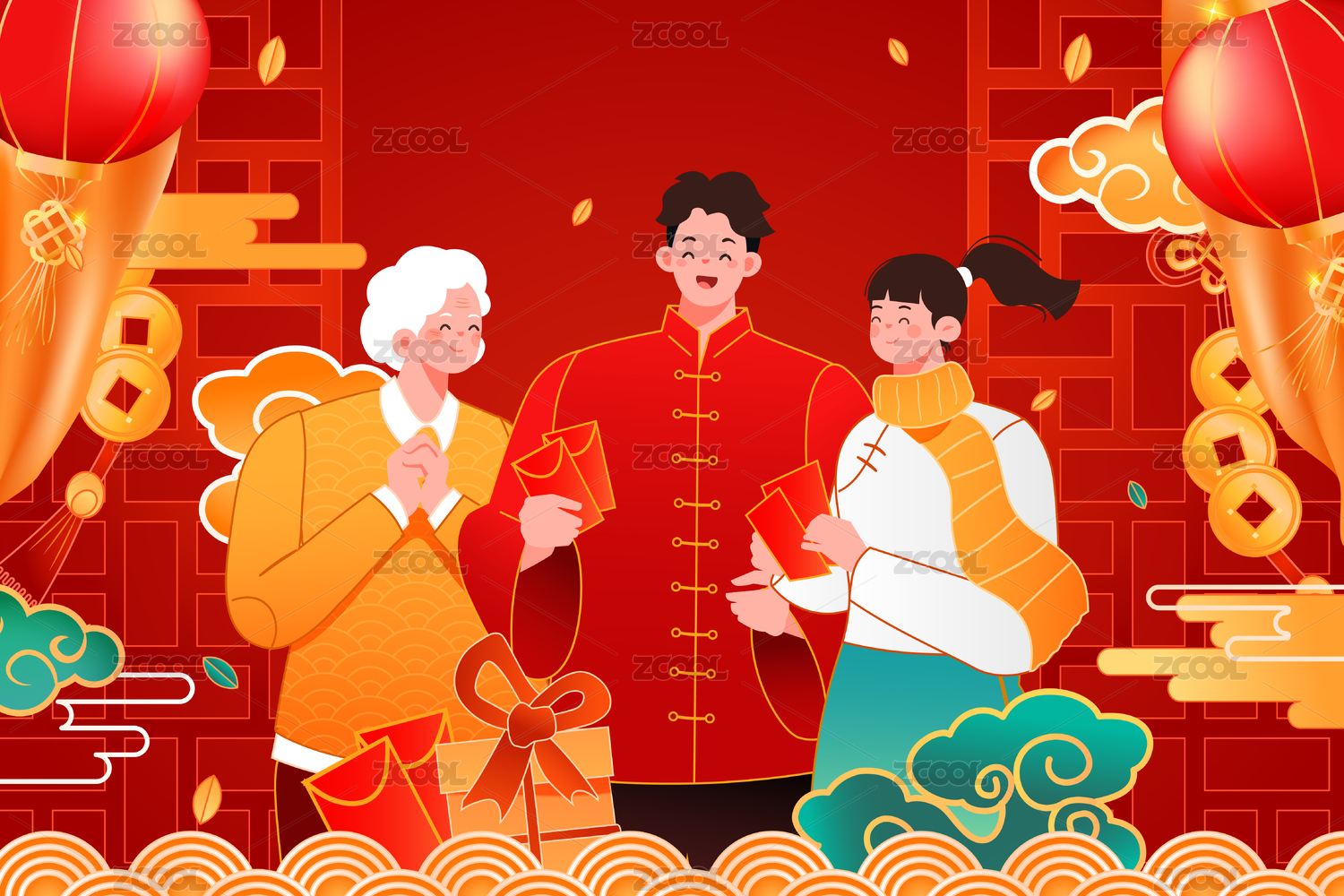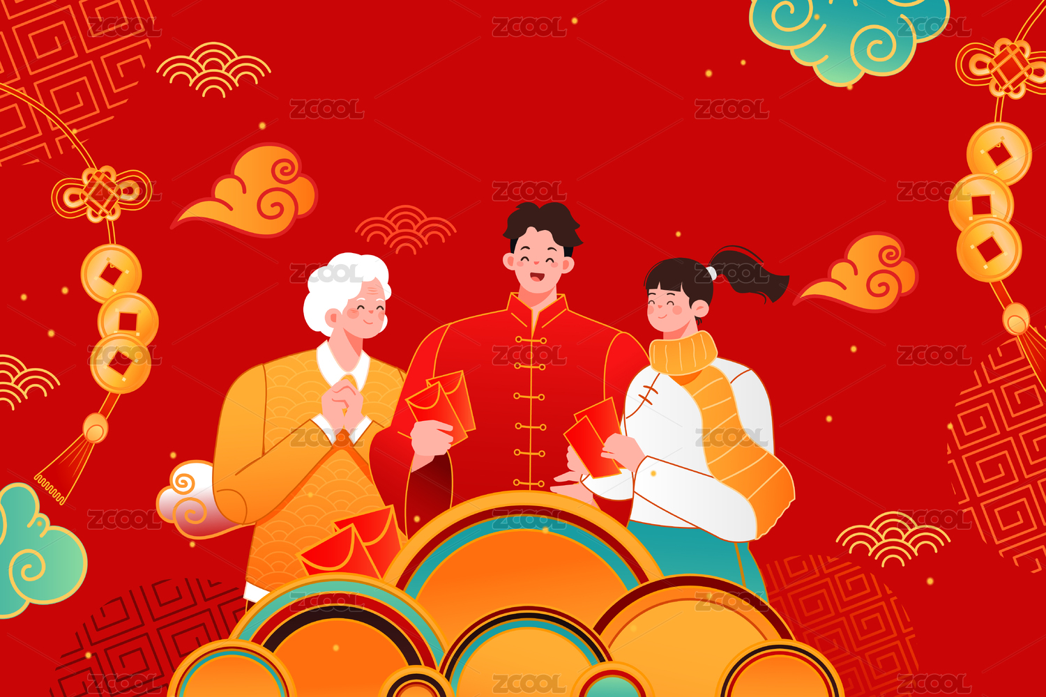 卡通2020鼠年新年春节家人拜年中国风背景矢量插画