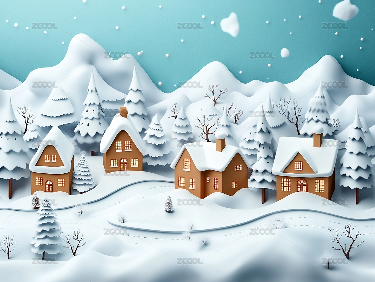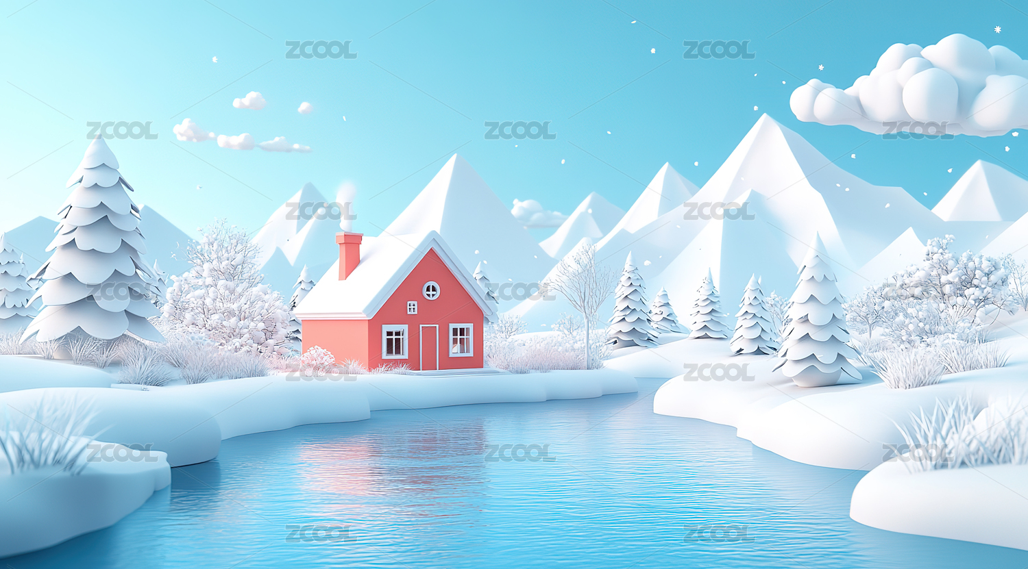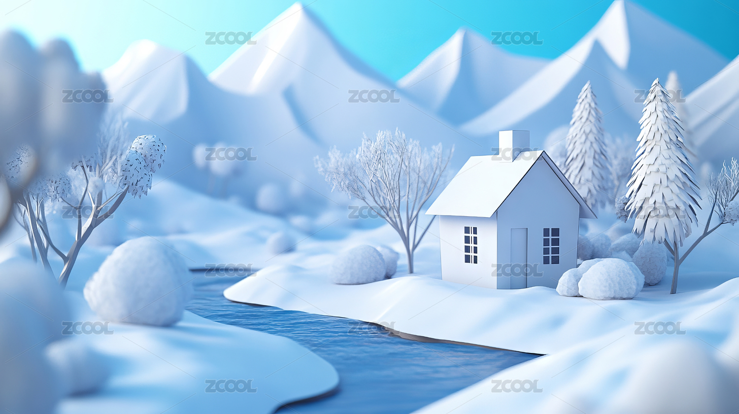 冬天白天有雪山坡上的木屋3D卡通立体插画