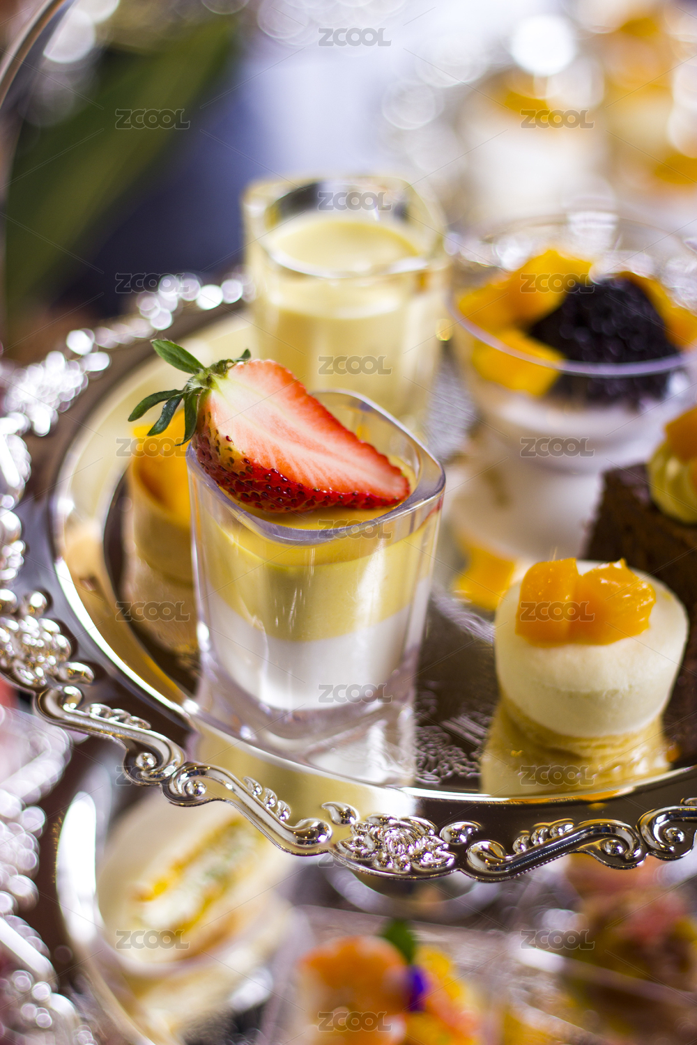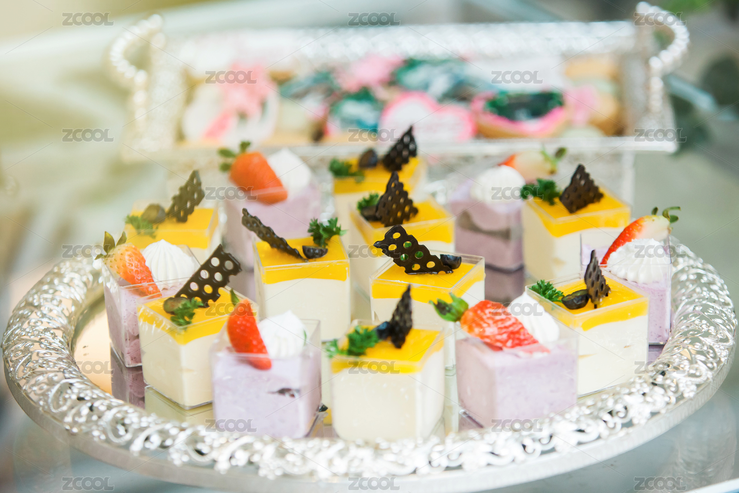 银色托盘里摆放着精致的小甜点。