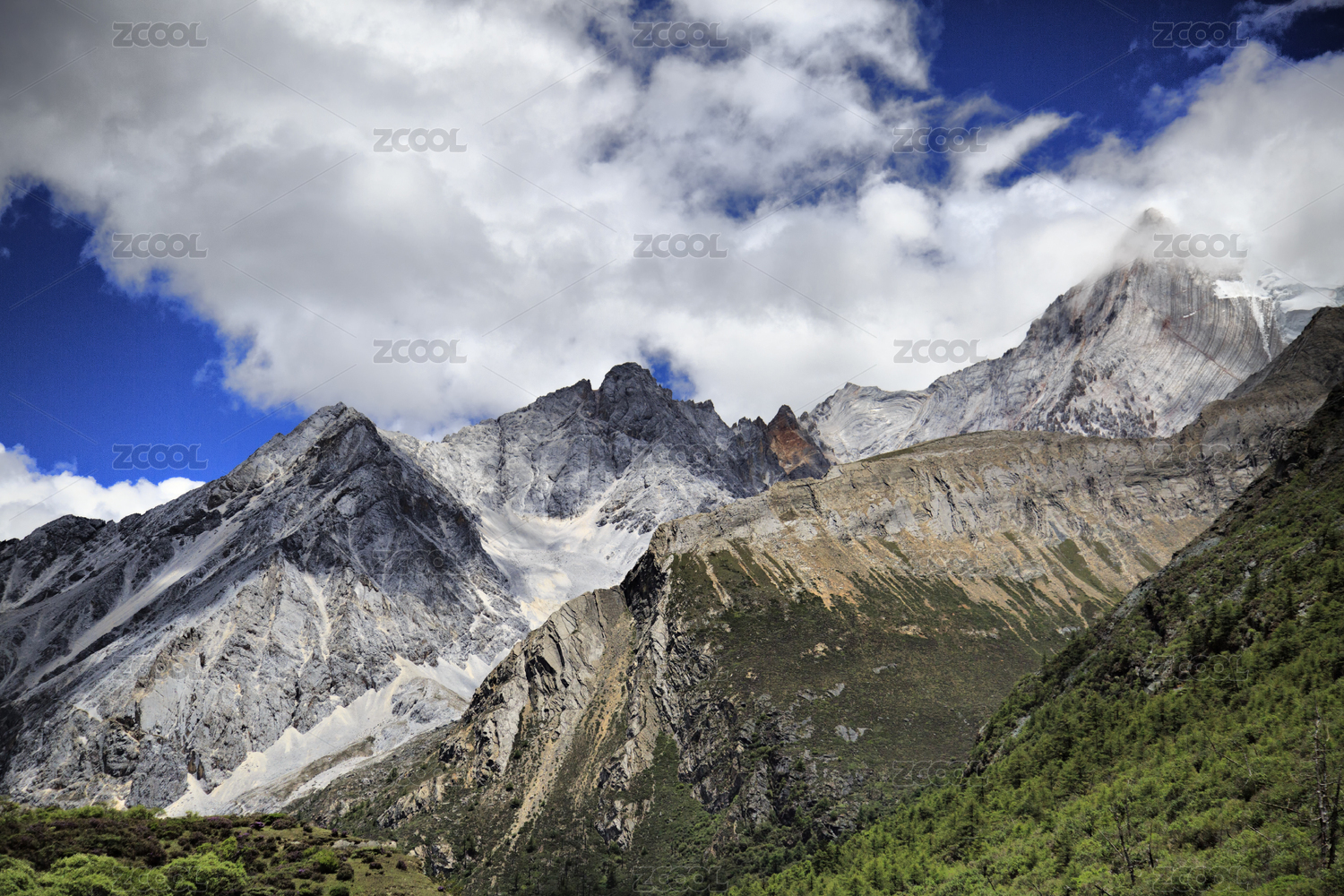 蓝天白云下的格聂神山