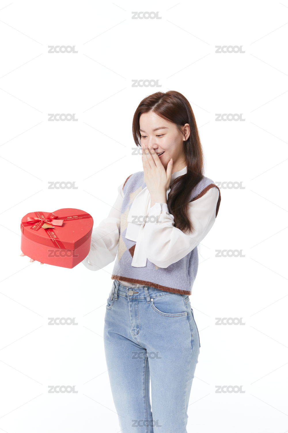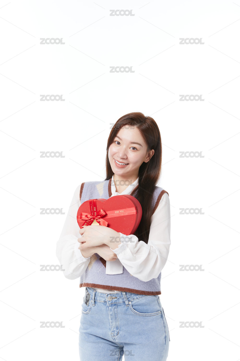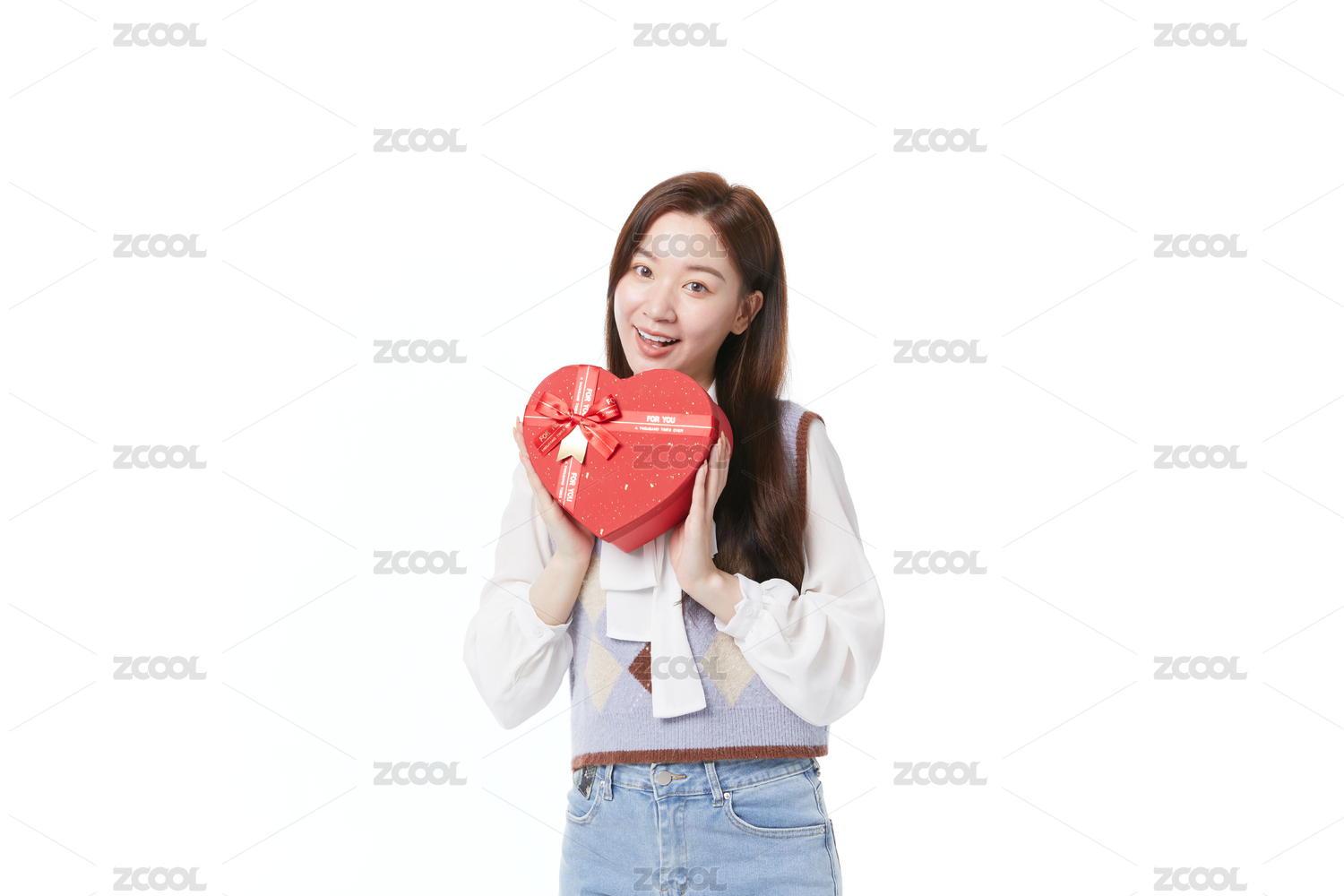 圣诞节节日白色背景下一个穿着红色圣诞节服装的中国亚洲美女女人拿着一个爱心心形的礼物礼盒送给爱人充满了惊喜与快乐幸福表达爱与感谢与祝福
