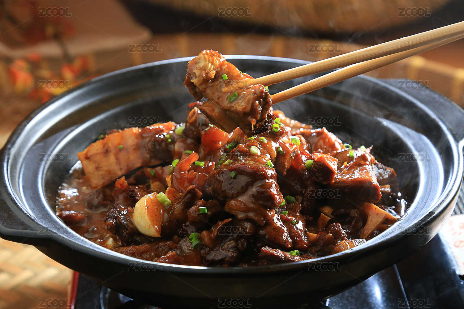 浅灰色背景上黑色砂锅里的砂锅驴肉