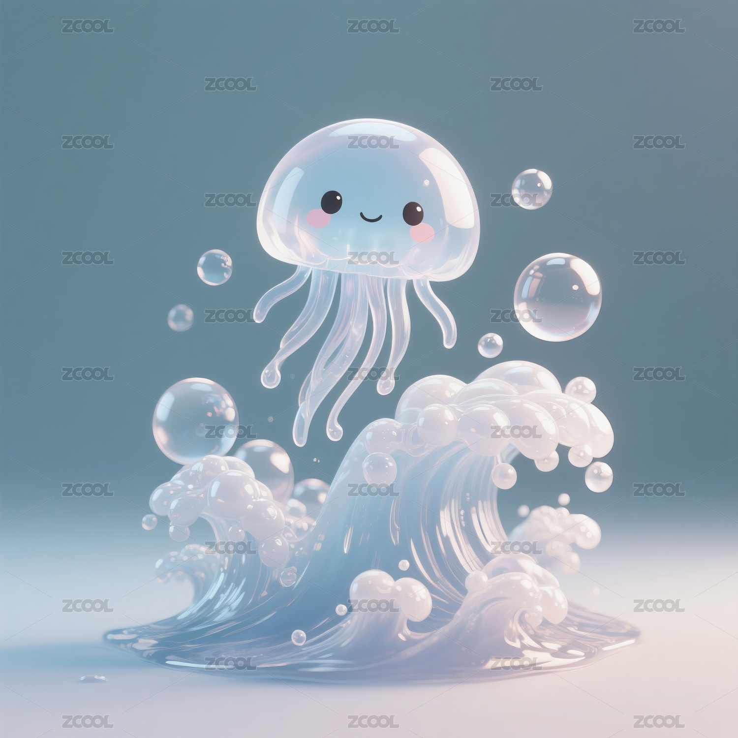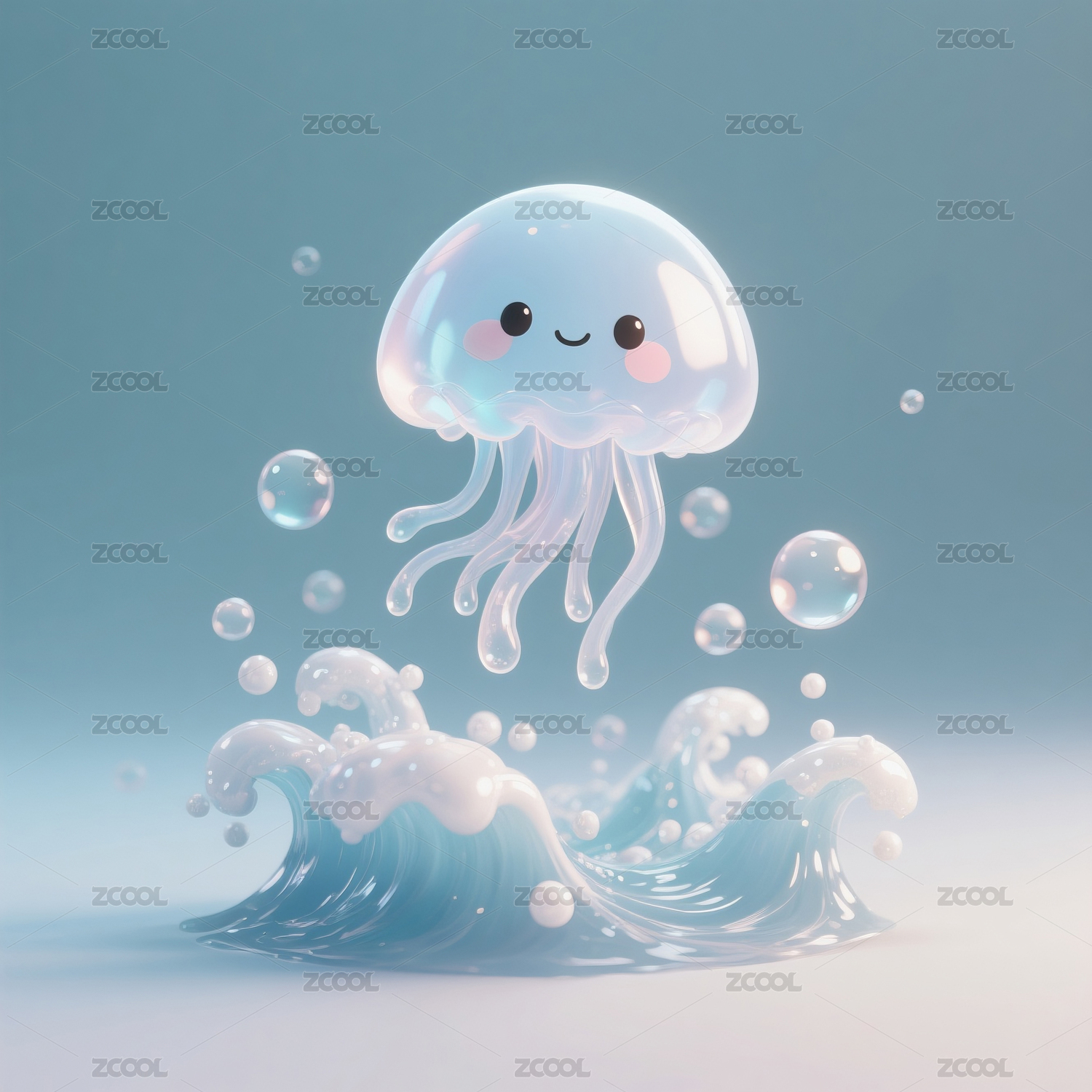 水母,卡通,插图,微笑,水泡,轻背景,蓝色斑点,透明,身体,触须