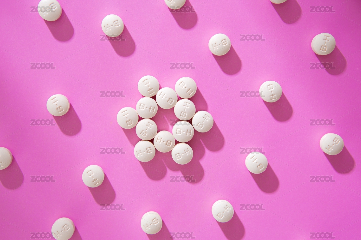 洋红色背景上排列的白色药片