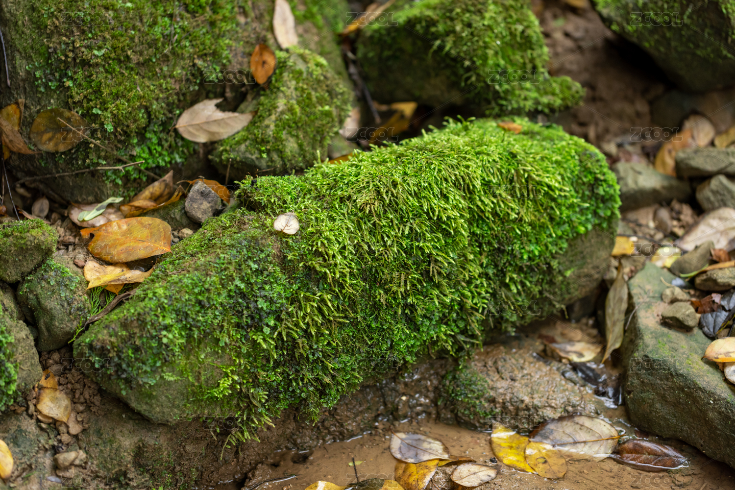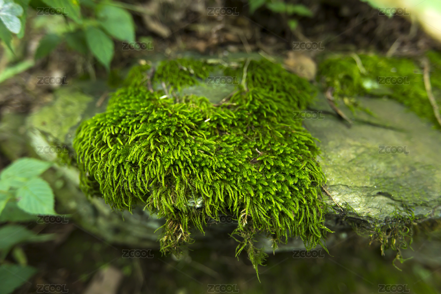 夏天生长在潮湿青石板上的翠绿色苔藓