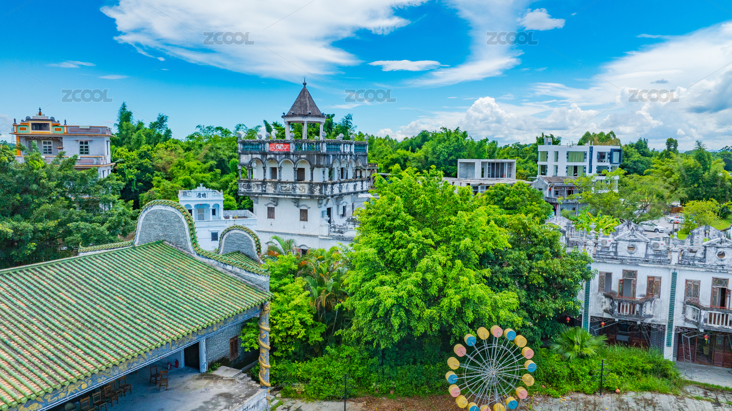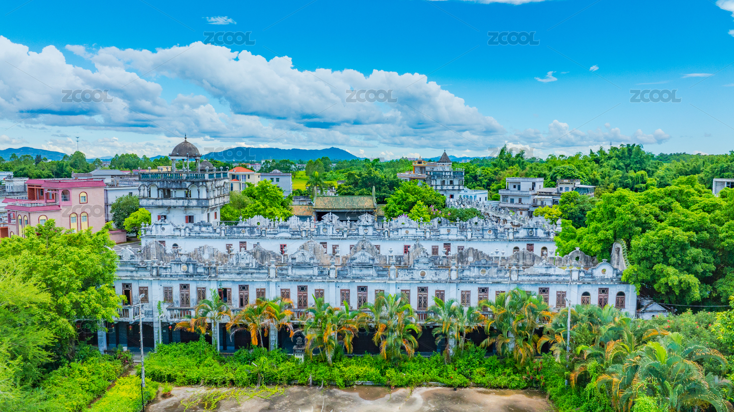 蓝天白云下的广东江门开平碉楼群碉庄