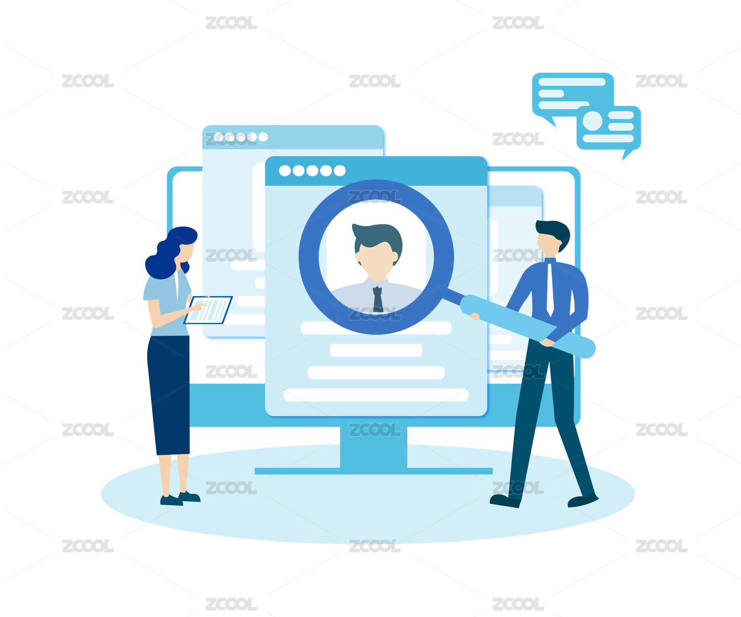男生和女生手拿放大镜站在电脑面前矢量插画