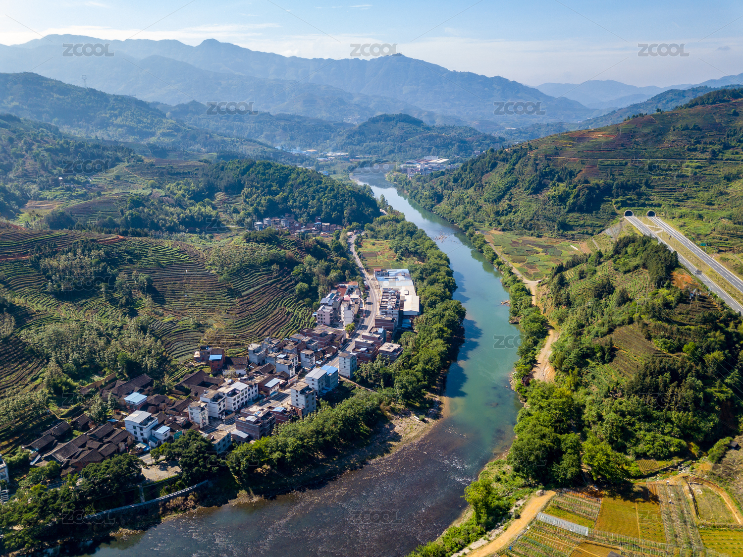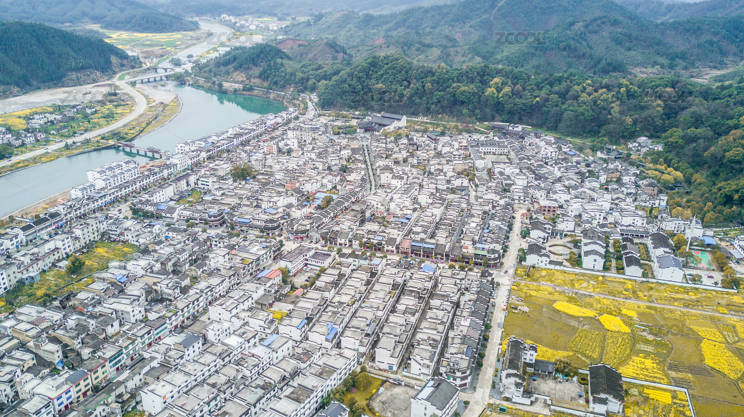 江南沿河村庄航拍视角