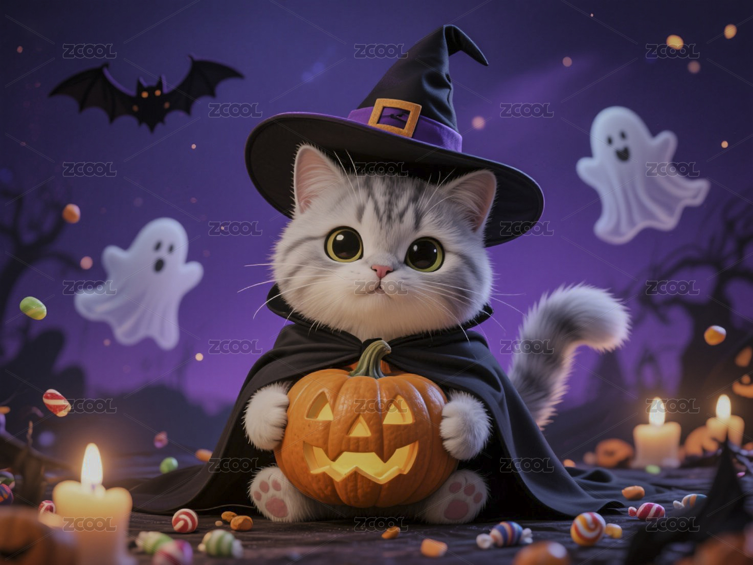 万圣节戴着女巫帽子的可爱猫和南瓜插画