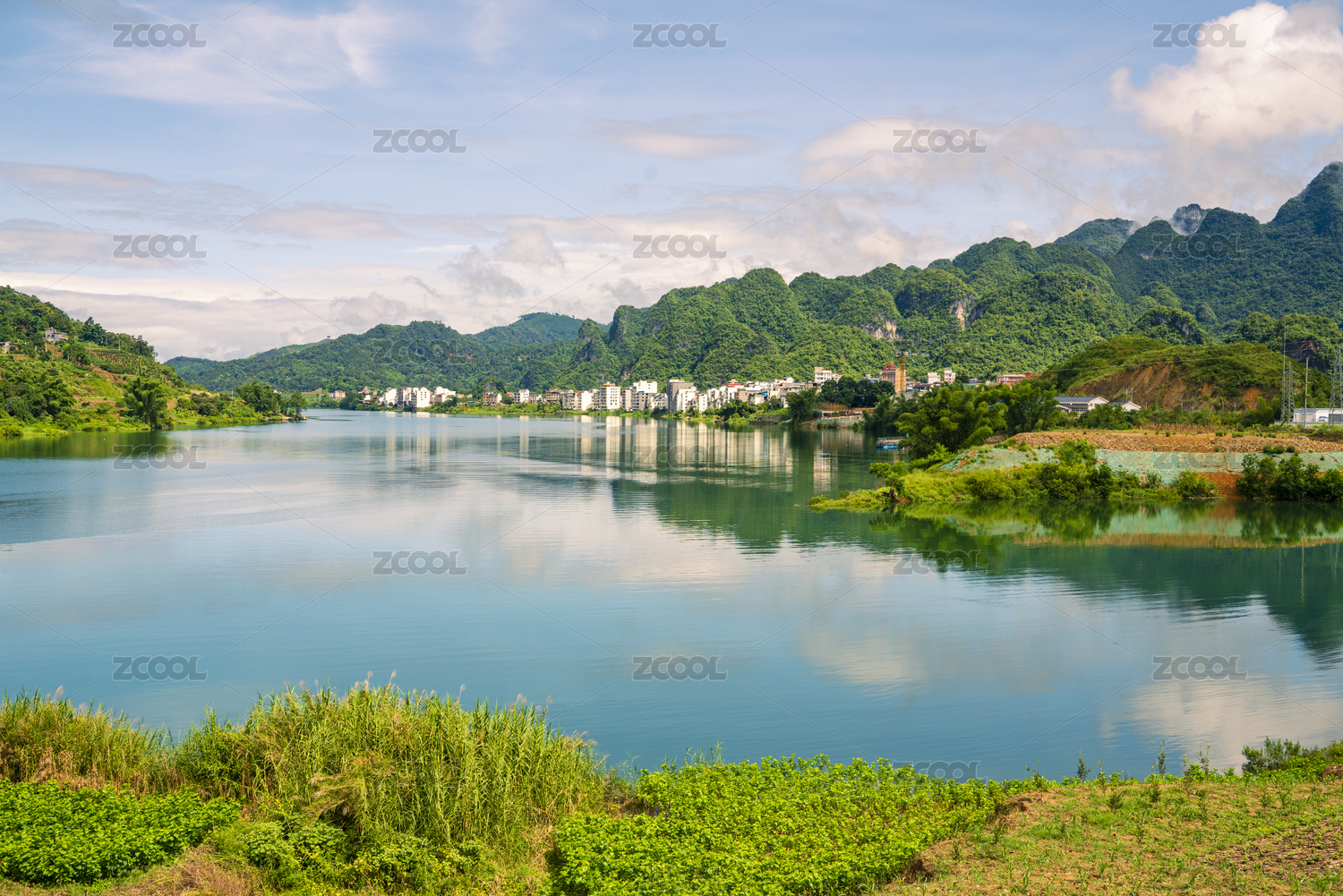 湖,水,天空,自然景观,山,云,徽派建筑,古镇,桃花潭,倒影