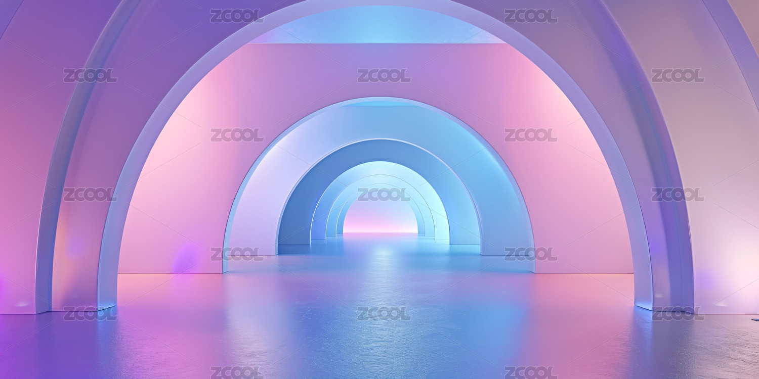 三维渲染蓝紫色霓虹灯拱门室内空间