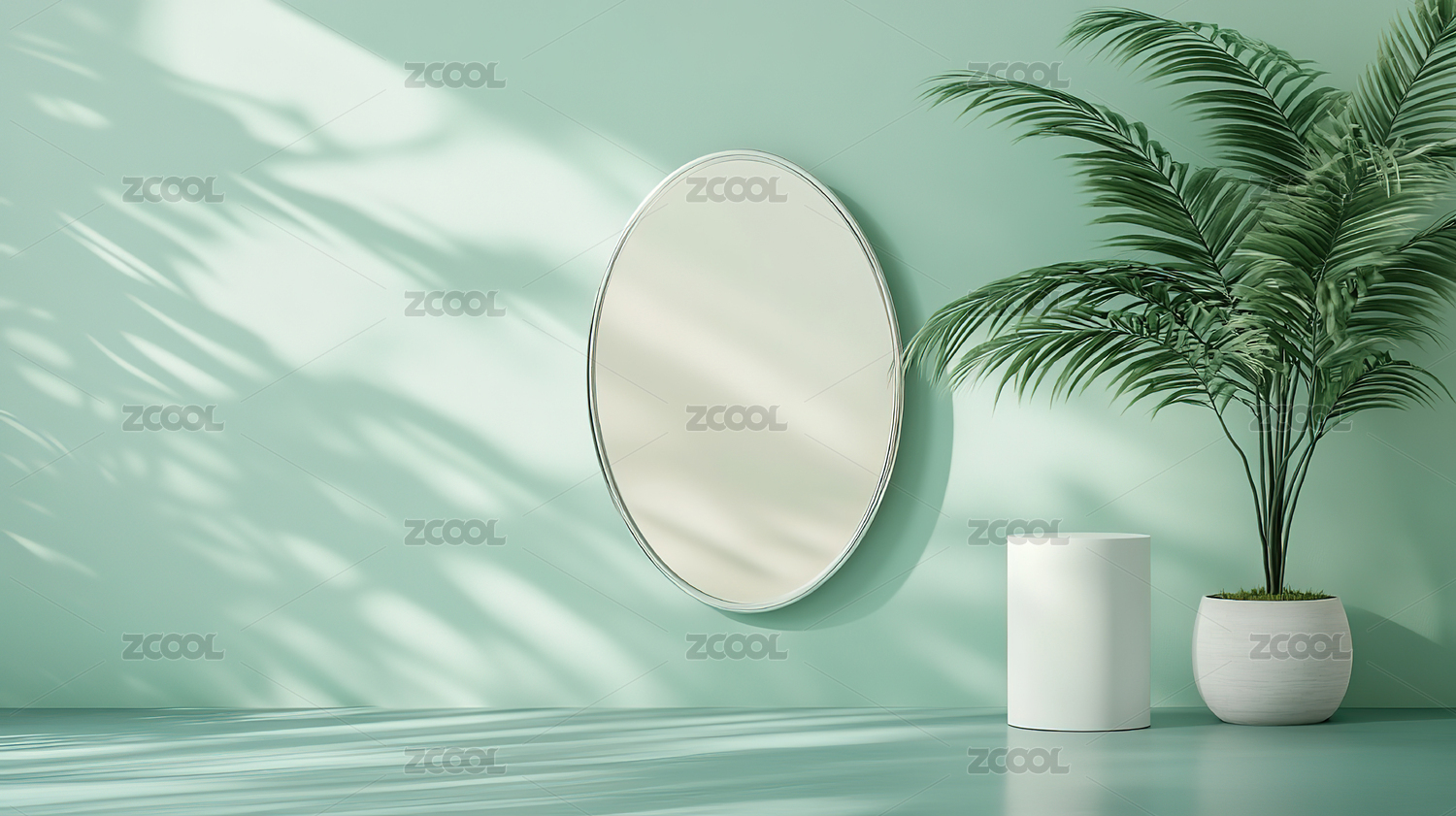 蓝色墙面圆形镜与绿植装饰