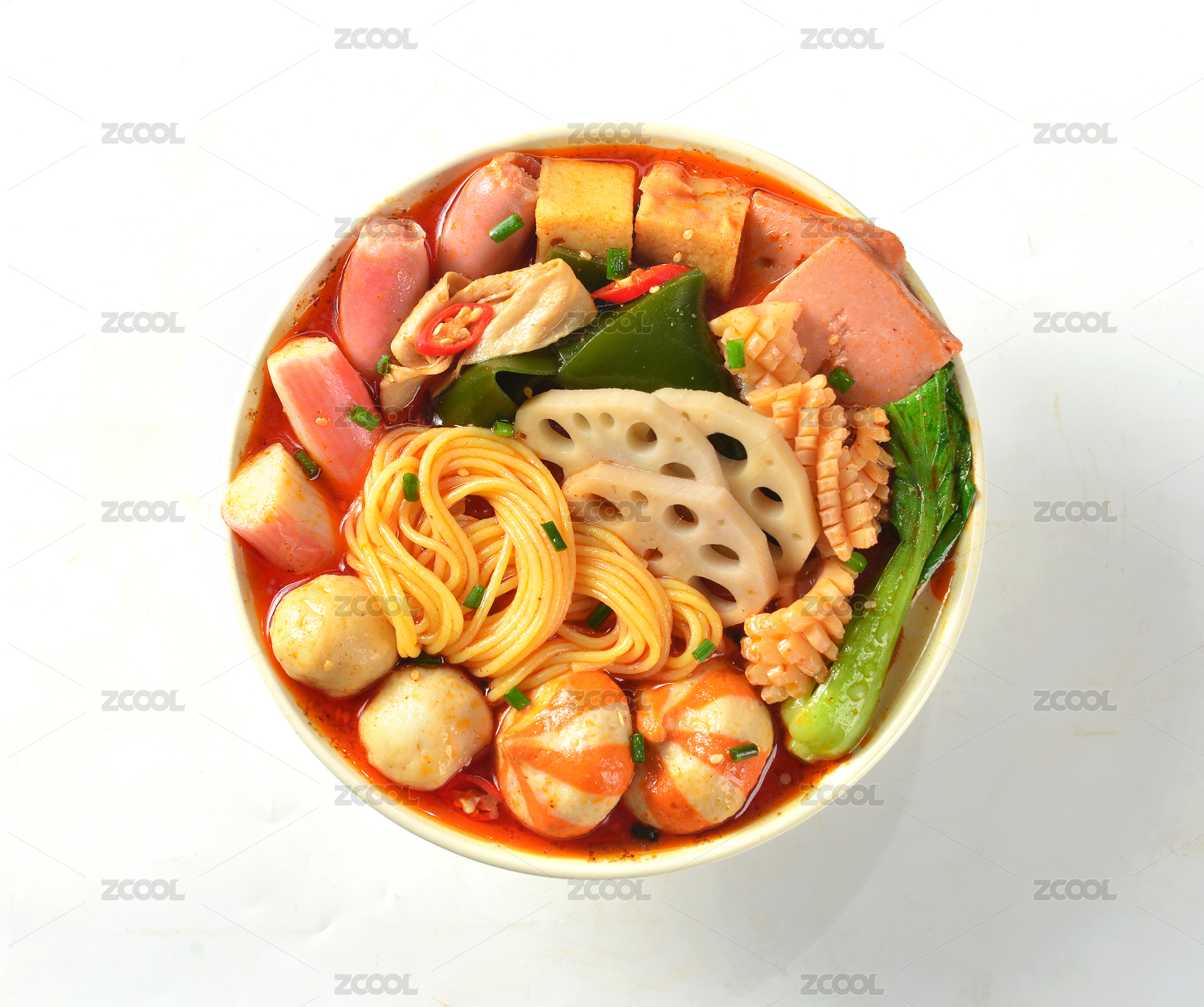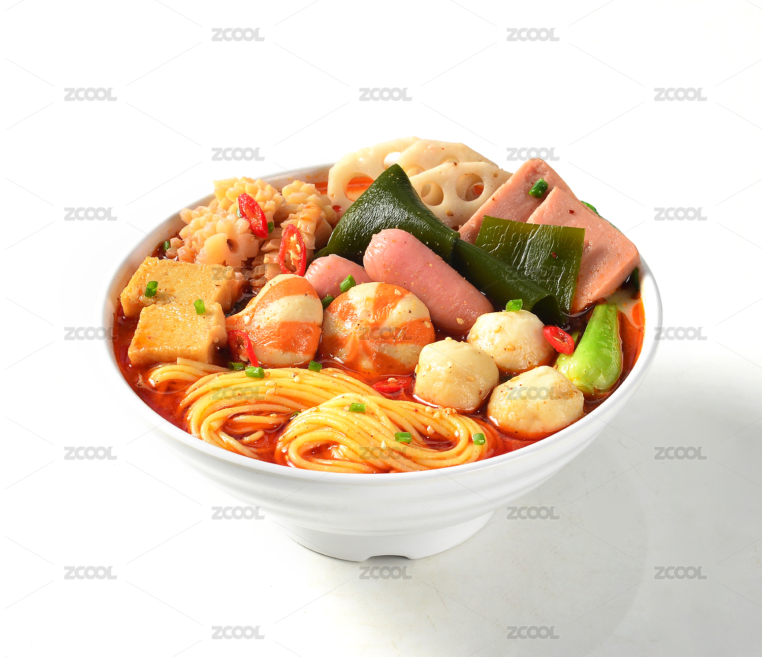白色背景上的一碗鸭血火腿冒菜