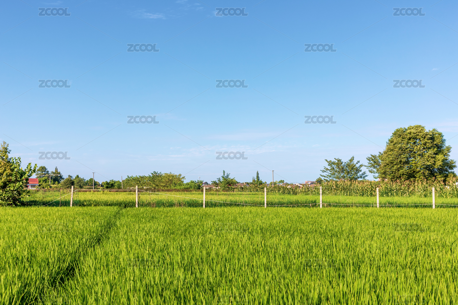 白天阳光下的绿色水稻稻田