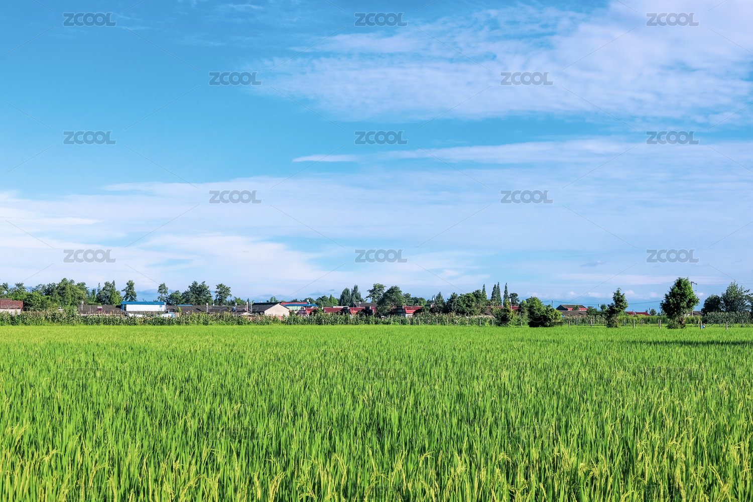 晴天时候蓝天白云下的水稻农田