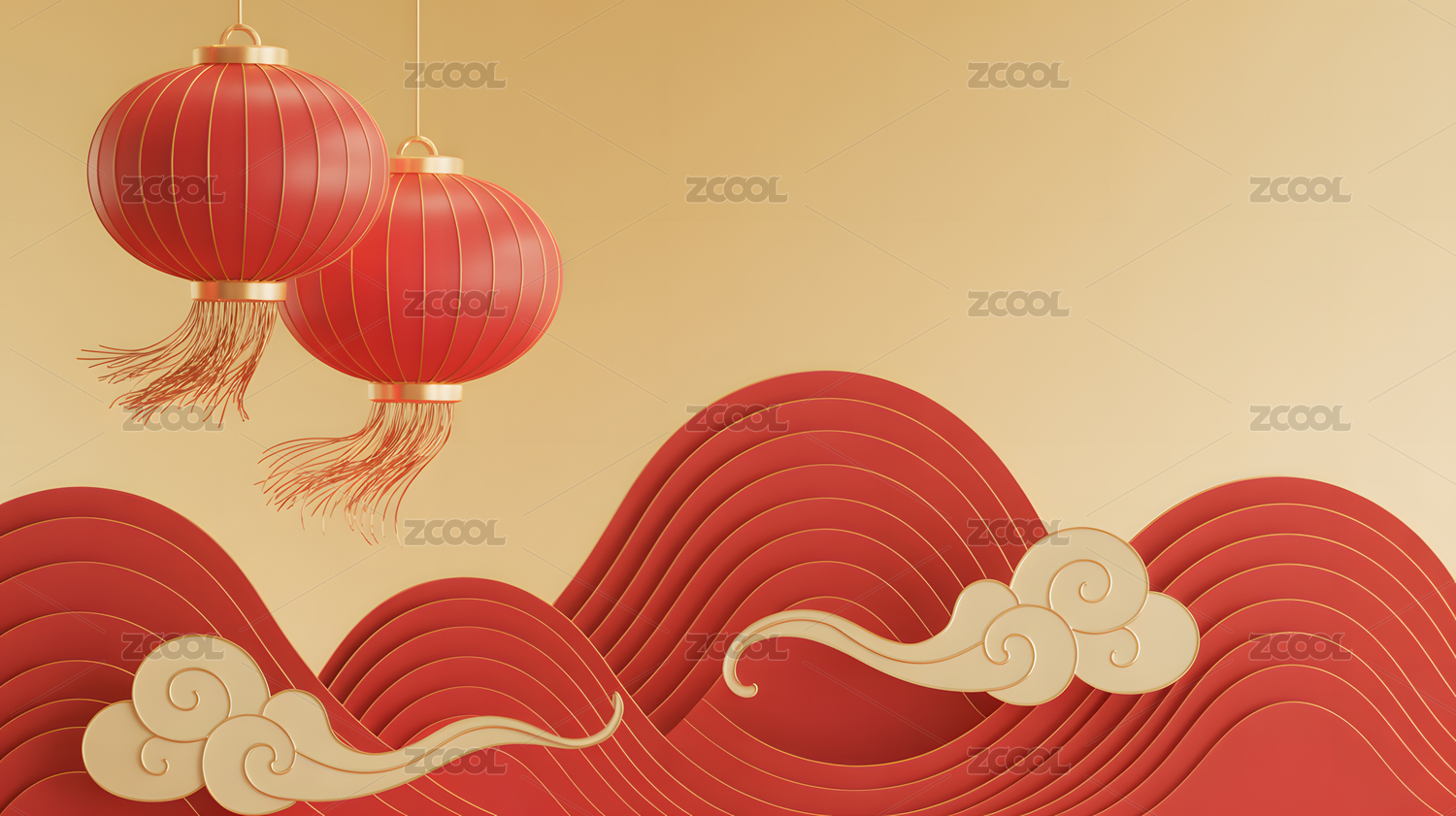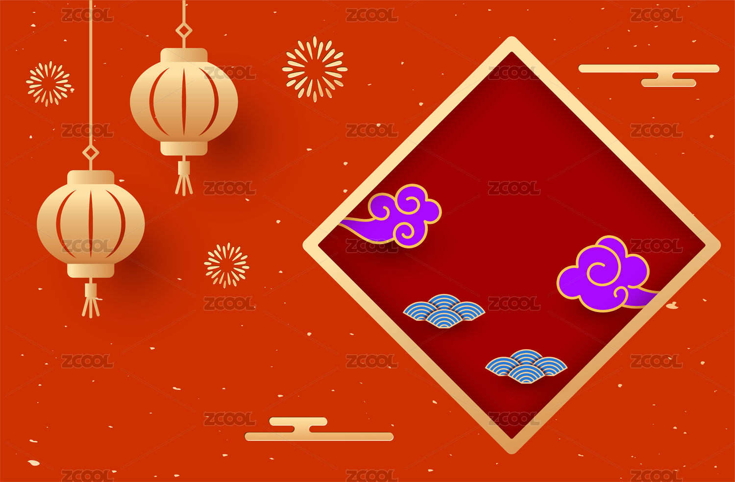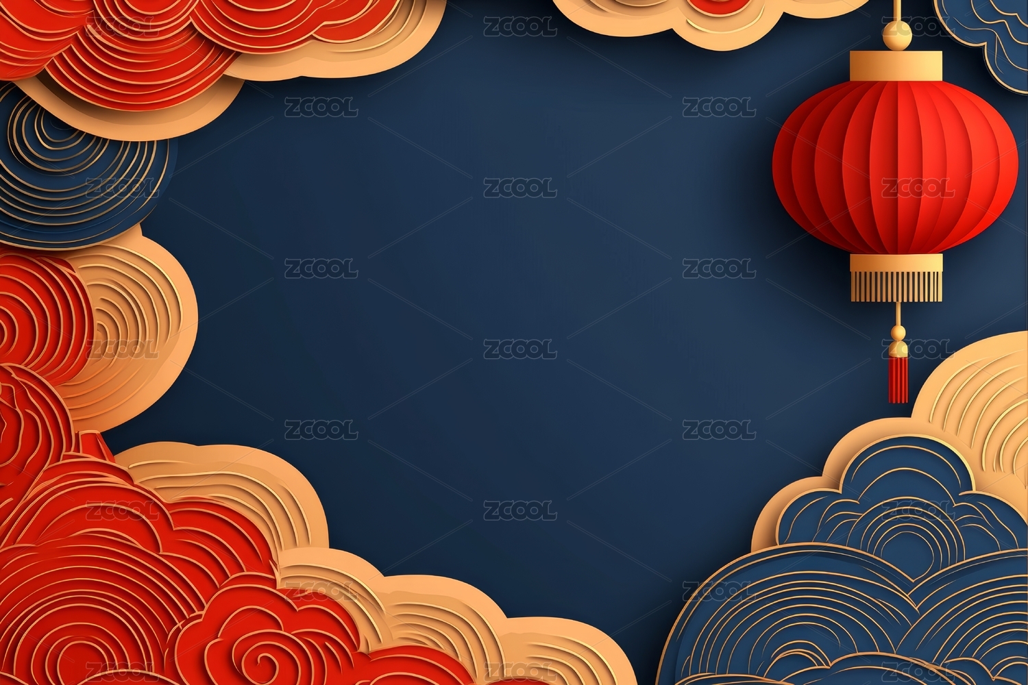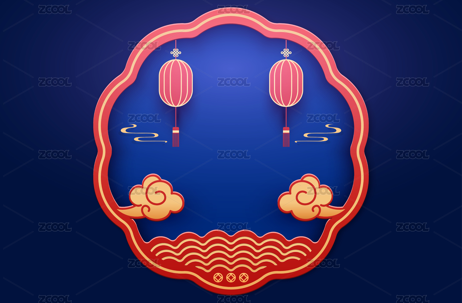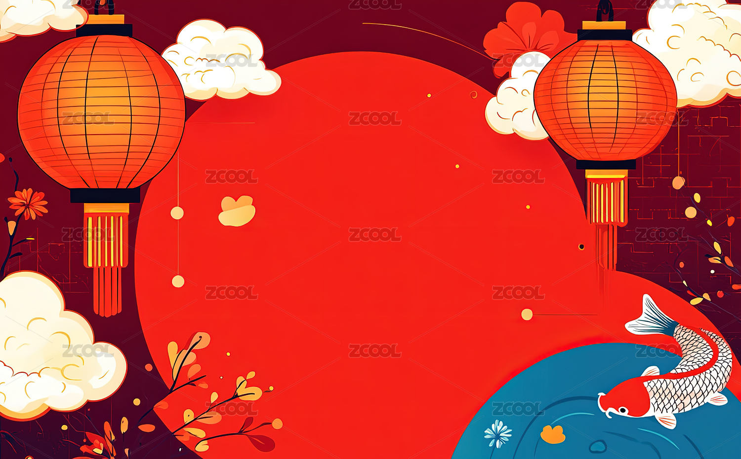 中国风新年剪纸锦鲤与灯笼云纹背景