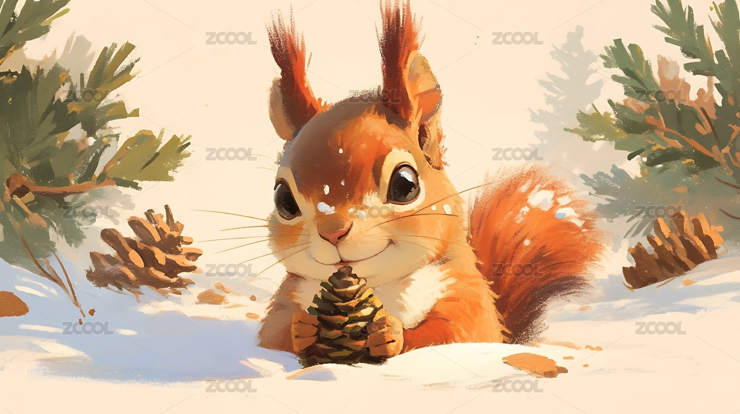 卡通松鼠蘑菇屋的梦幻冬日森林场景