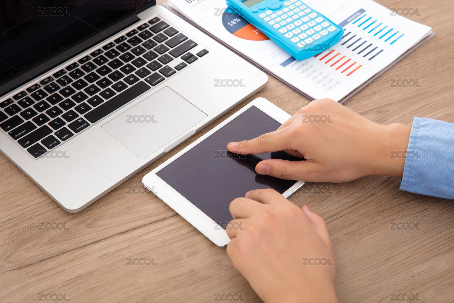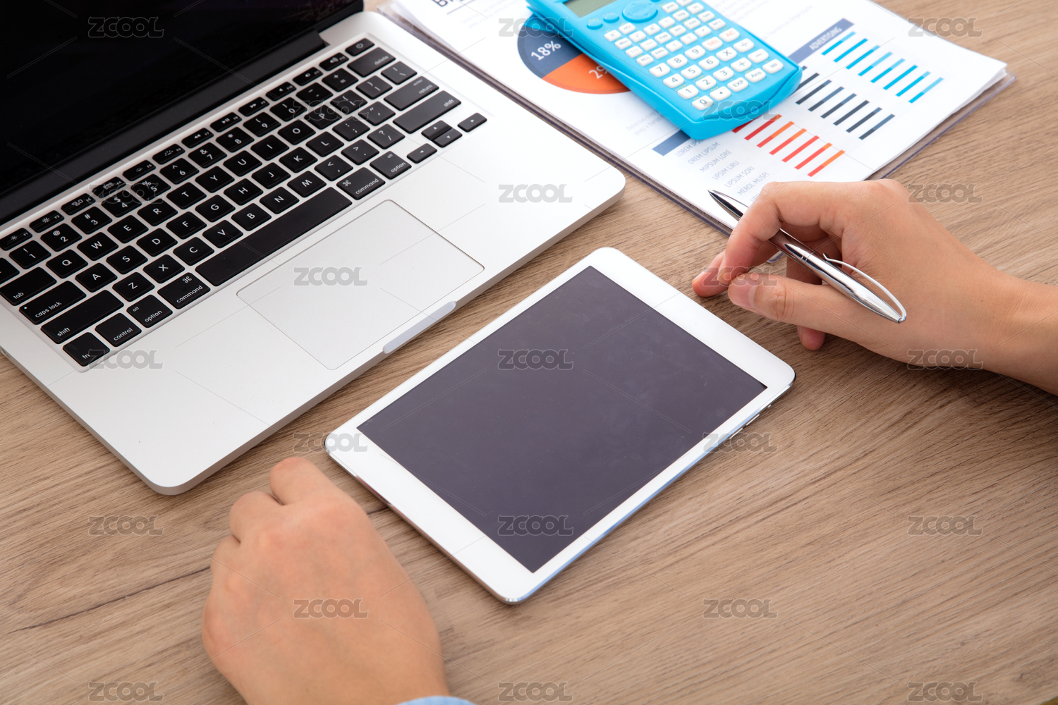 关闭的两个业务妇女工作在数字平板垫和拿着一支笔来解释空白屏幕上的项目了。