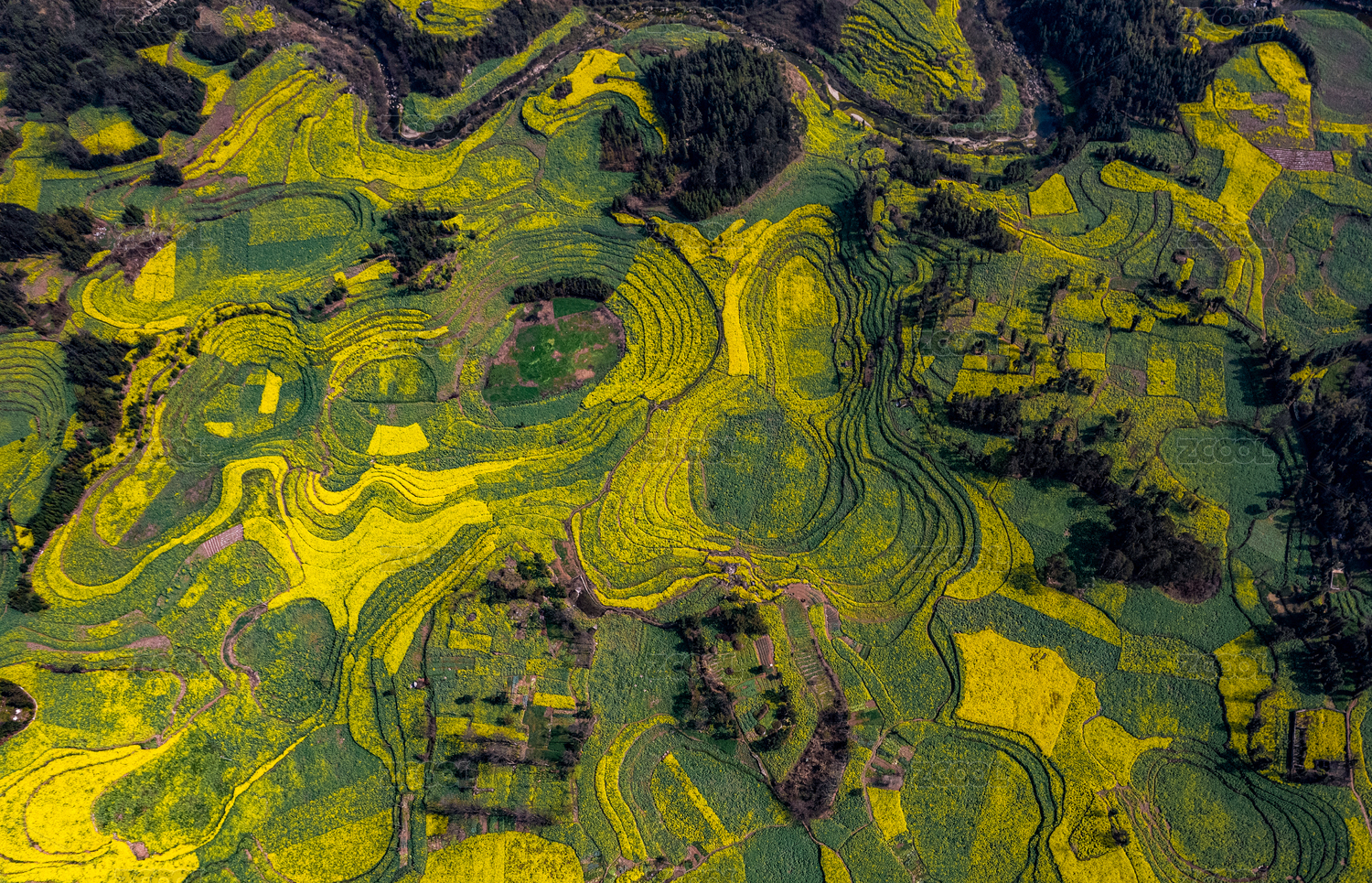 航拍罗平牛街螺丝田盛开的油菜花